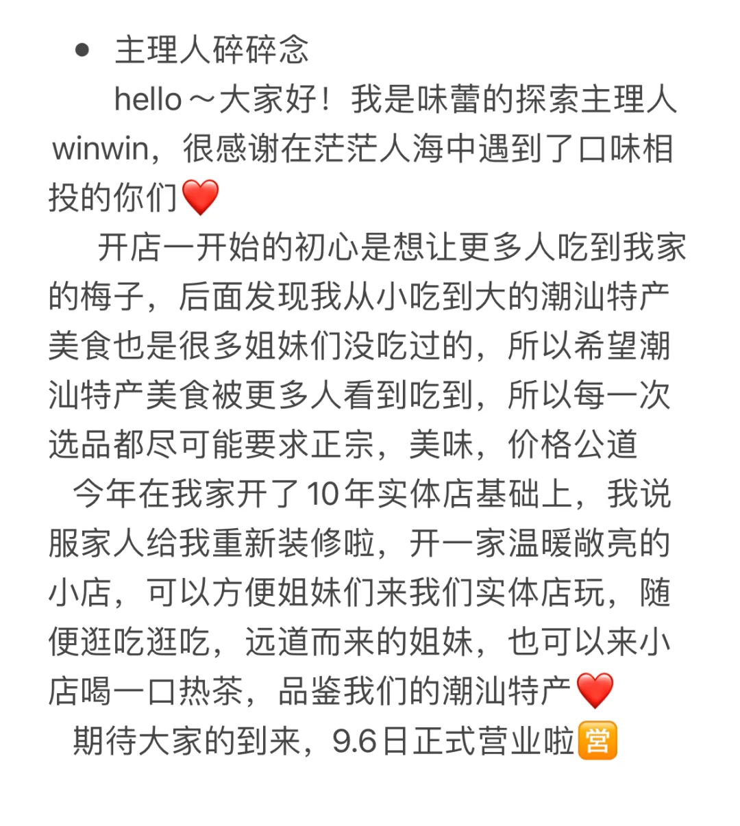 开了一个实体店店铺账号欢迎大家来踢踢[飞吻R][飞吻R][飞吻R] 实体店铺主要是卖罐装、潮汕特产礼盒、当地手作美食、潮汕特色茶叶…… 普宁的姐妹们可以导航来哈!开在老市场里面,价格明码标价,欢迎找我们玩哦,免费品鉴各种潮汕特产❤️ 有需要卖潮汕特产的姐妹可以关注下哦❤️