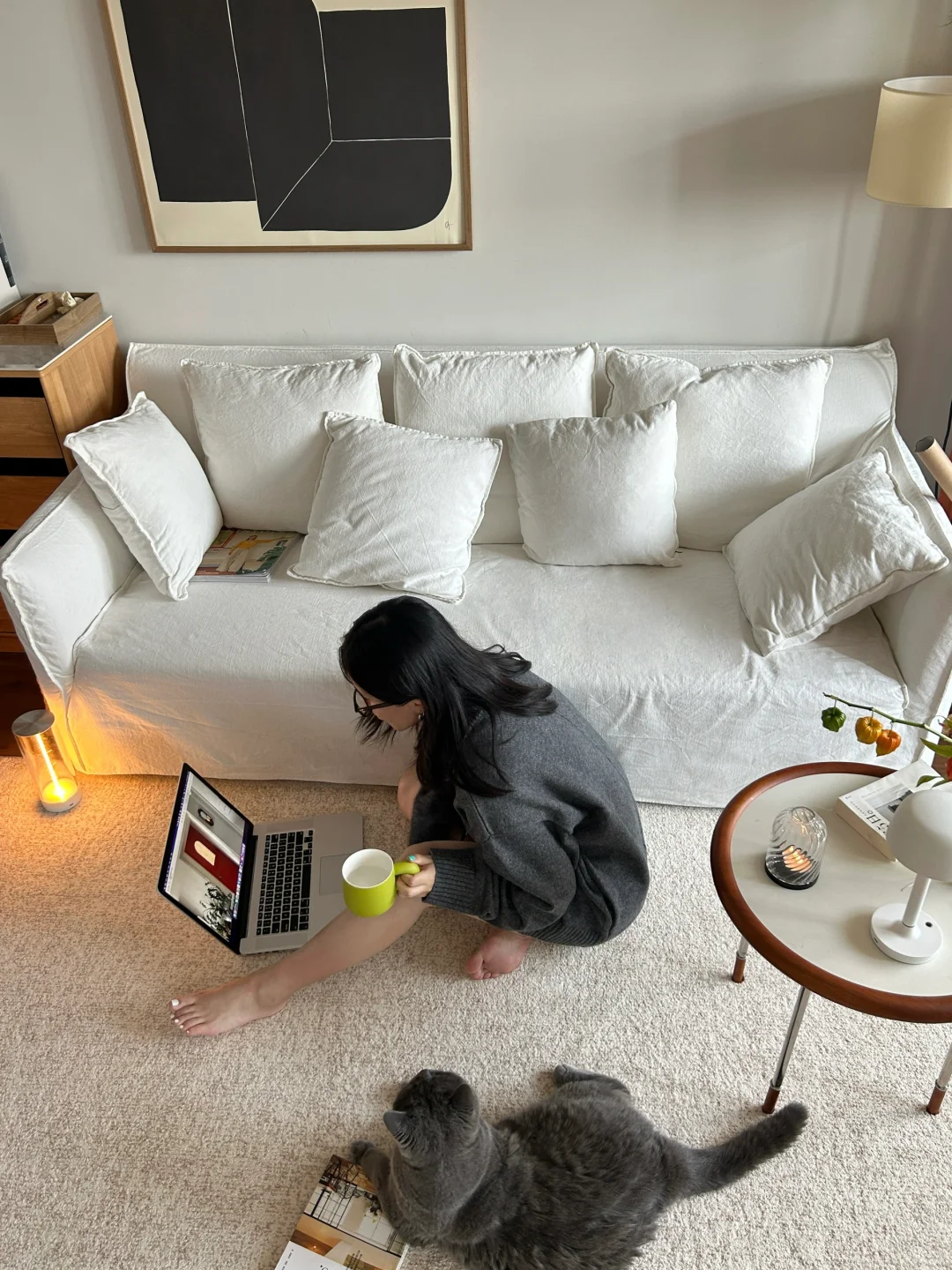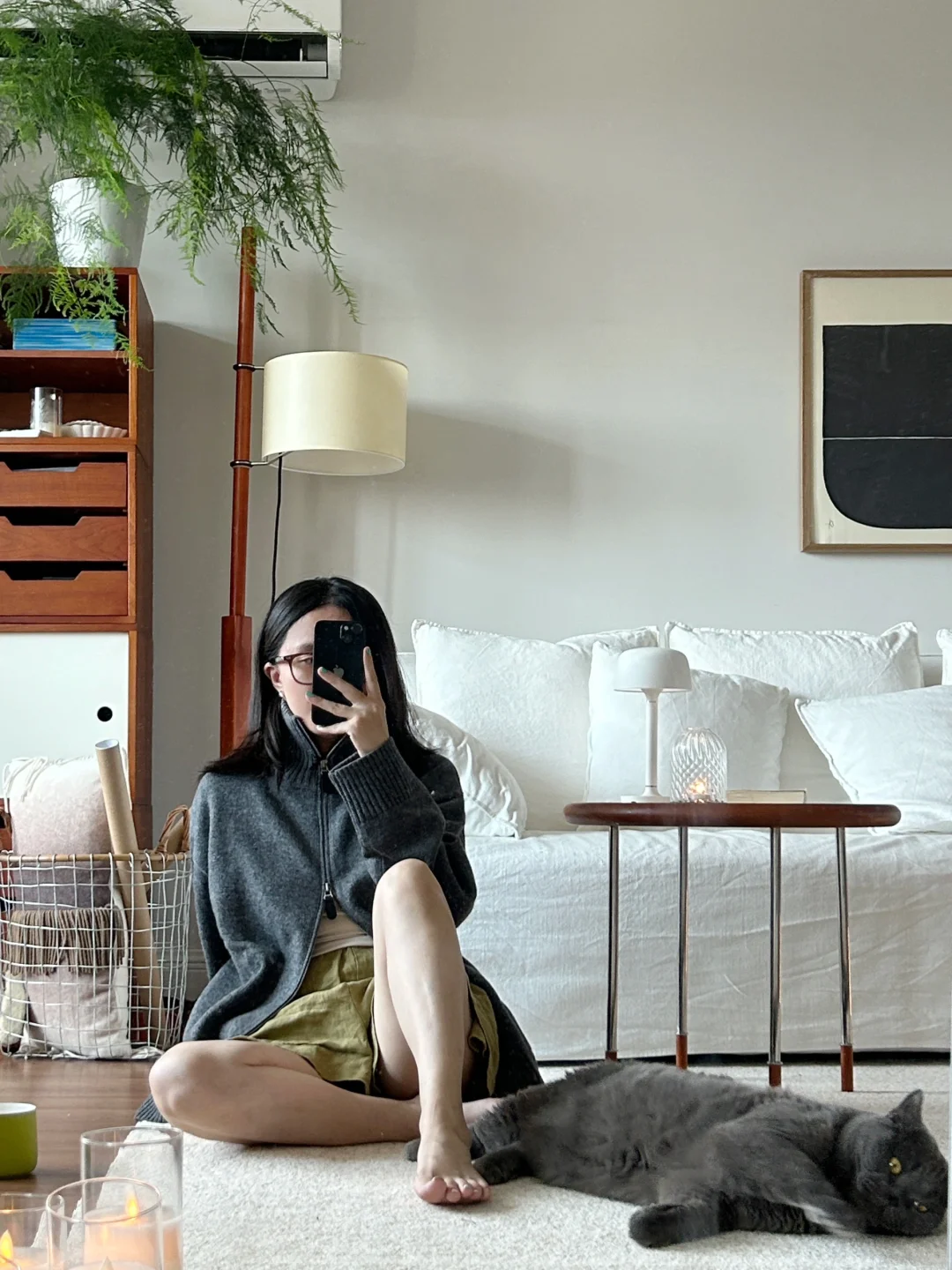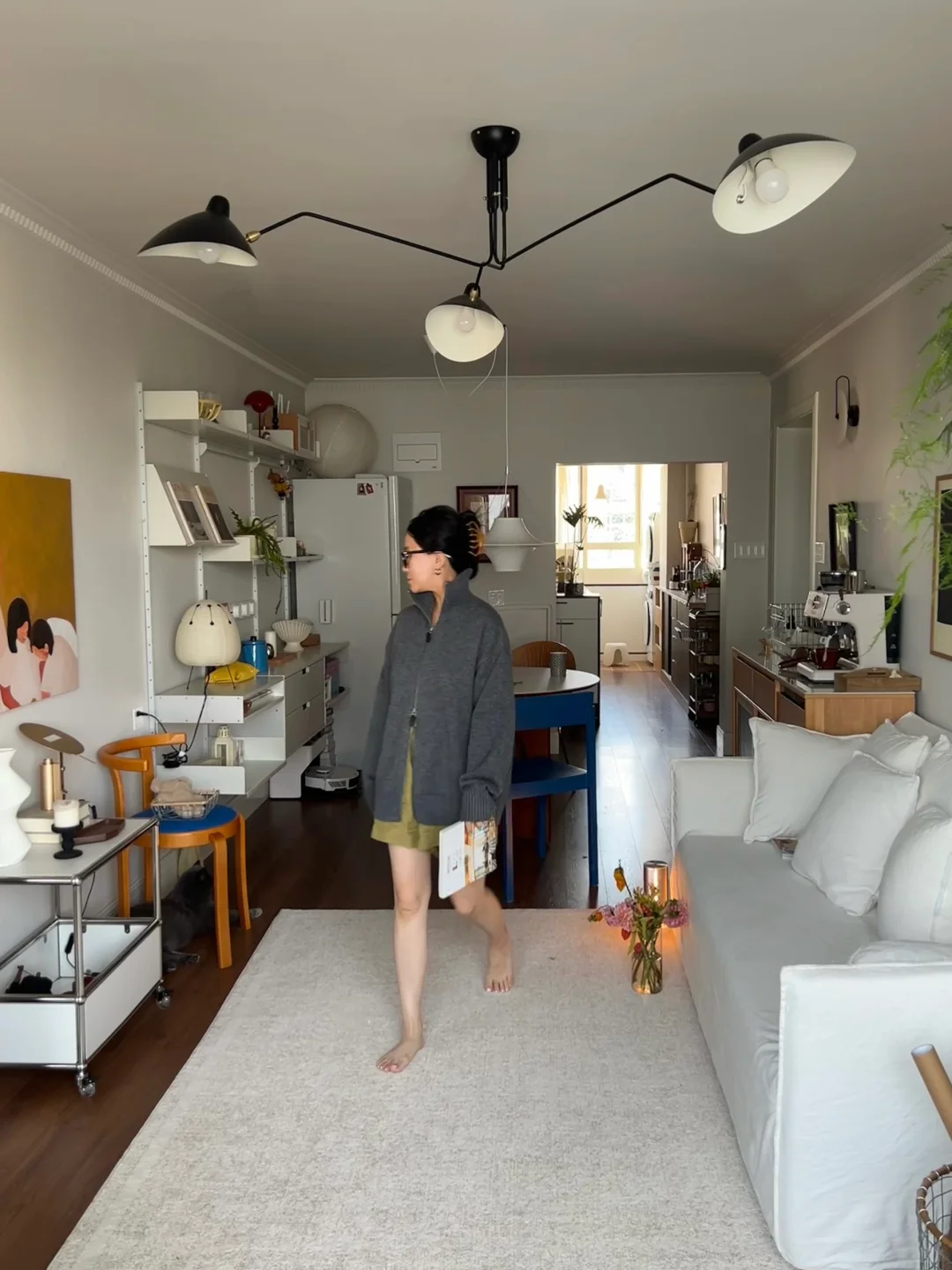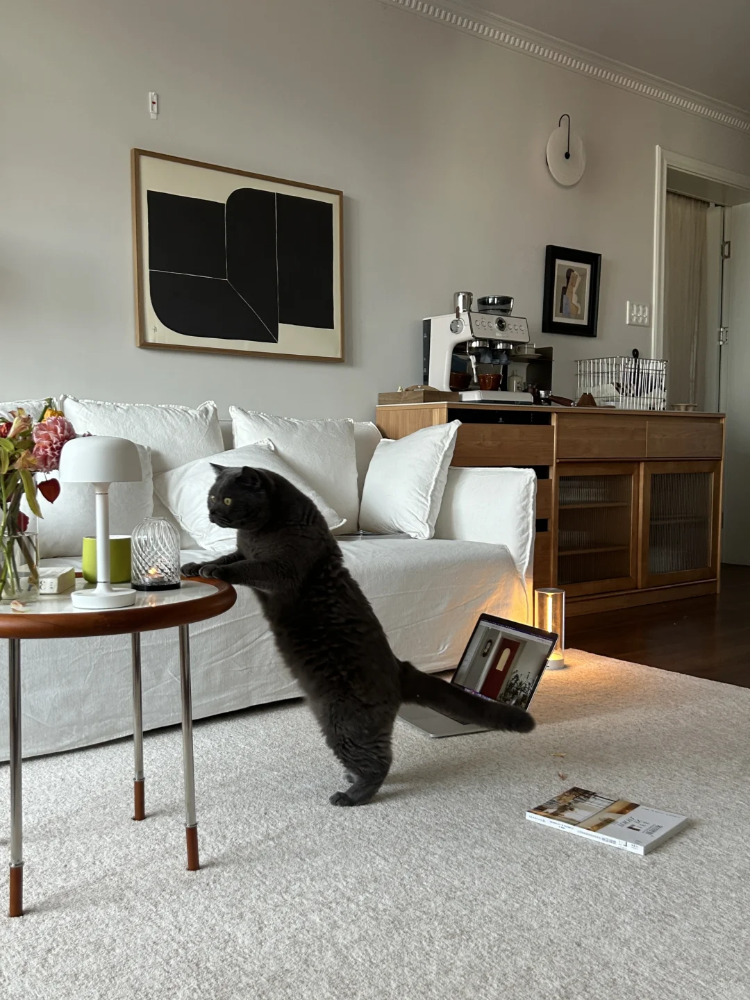 地毯的作用毋庸置疑,让客厅区域有了框架归属感与舒适温暖的氛围,也让人忍不住想在谈面上肆意打滚。能和崽崽们随意躺卧互动的时光,就是刚刚好的生活~