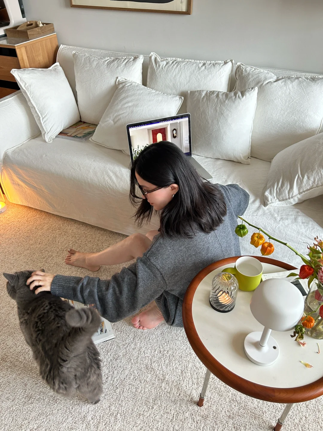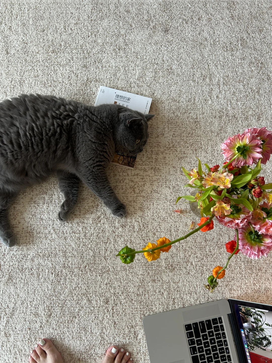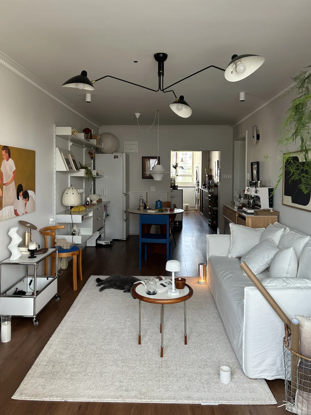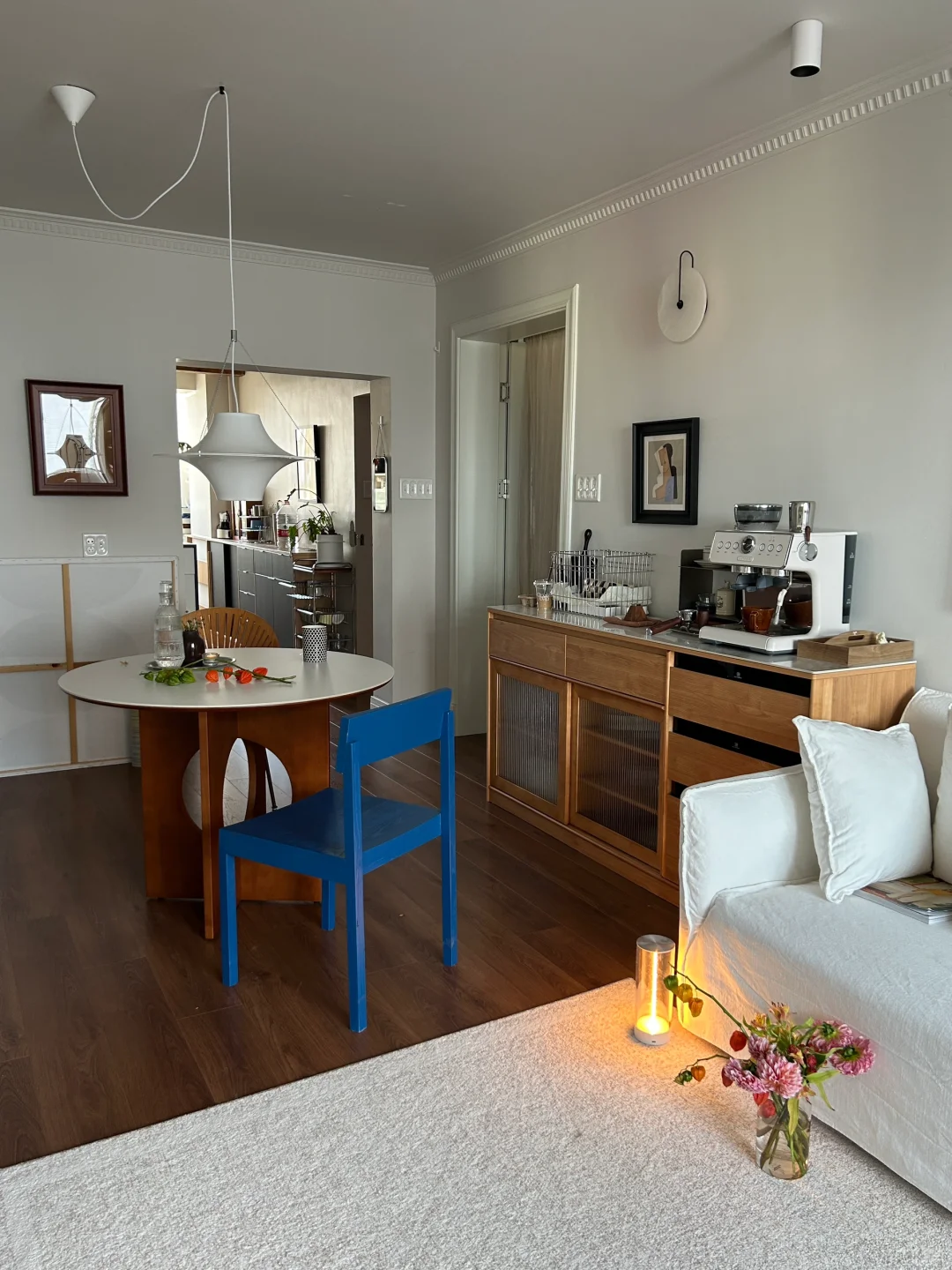 地毯的作用毋庸置疑,让客厅区域有了框架归属感与舒适温暖的氛围,也让人忍不住想在谈面上肆意打滚。能和崽崽们随意躺卧互动的时光,就是刚刚好的生活~