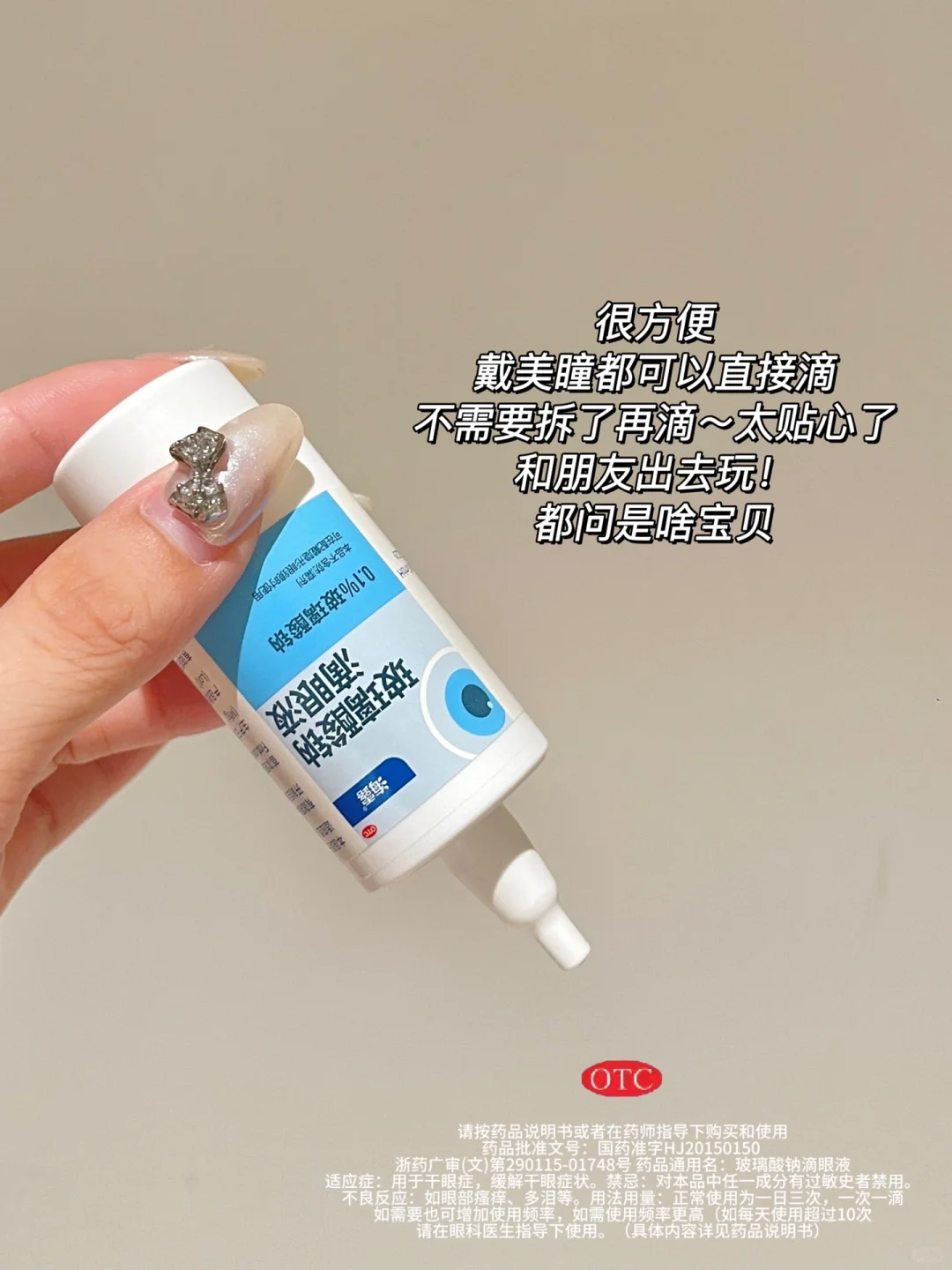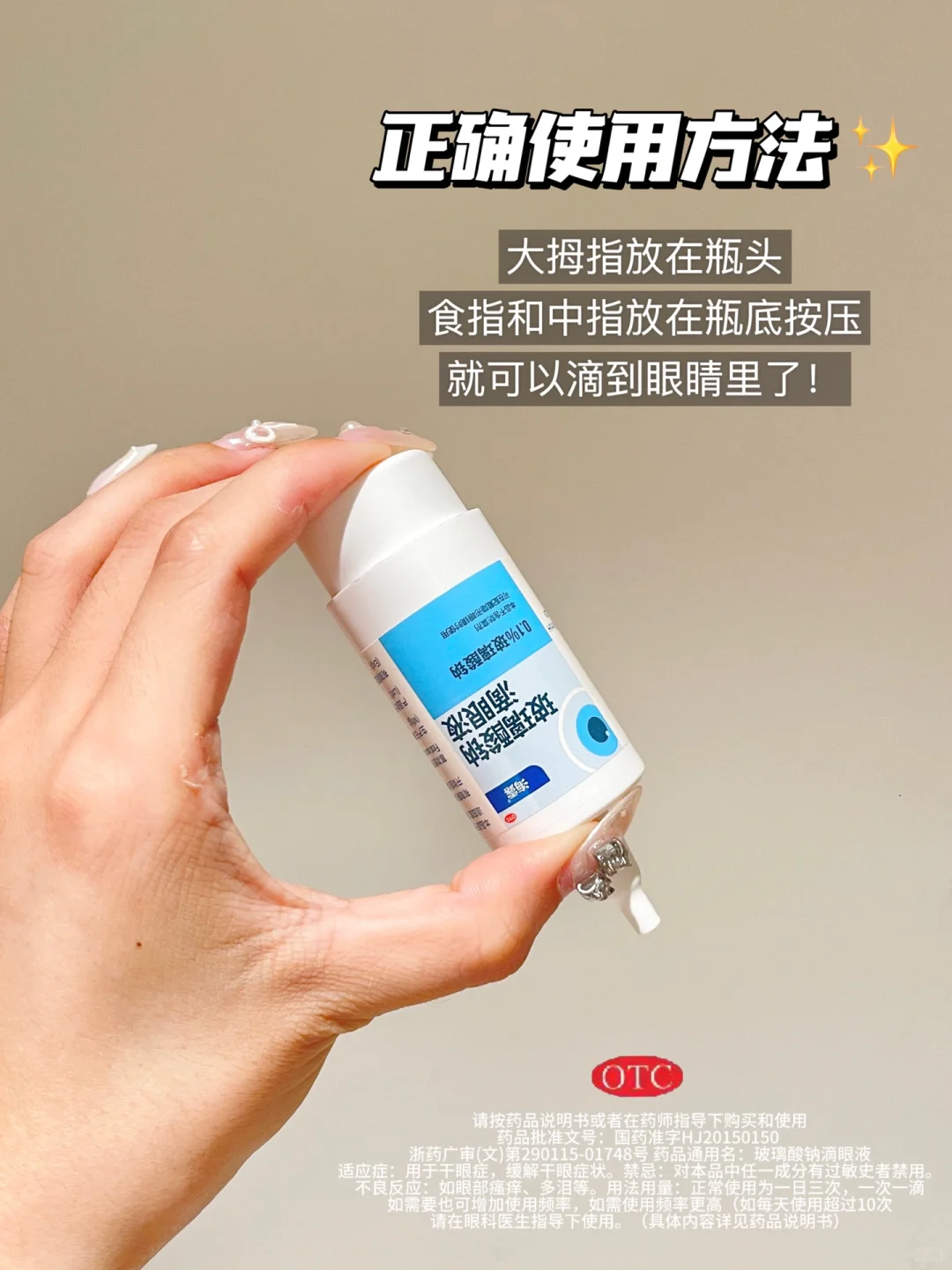 浙药广审(文)第290115-01748号 药品通用名:玻璃酸钠滴眼液 适应症:用于干眼症,缓解干眼症状。禁忌:对本品中任一成分有过敏史者禁用。不良反应:如眼部瘙痒、多泪等。用法用量:正常使用为一日三次,一次一滴,如需要也可增加使用频率,如需使用频率更高(如每天使用超过10次)请在眼科医生指导下使用。(具体内容详见药品说明书)