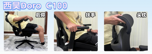 西昊这款的最大后仰角度也是145°,午休时候的体验也是不错的,扶手的话只能进行上下、前后调节,维度比较少;头枕的话也只能旋转角度,不能进行上下调节;椅背虽然也能调节,但是可以调节的维度没有夏草木那款高,整体来说场景适配度中等。