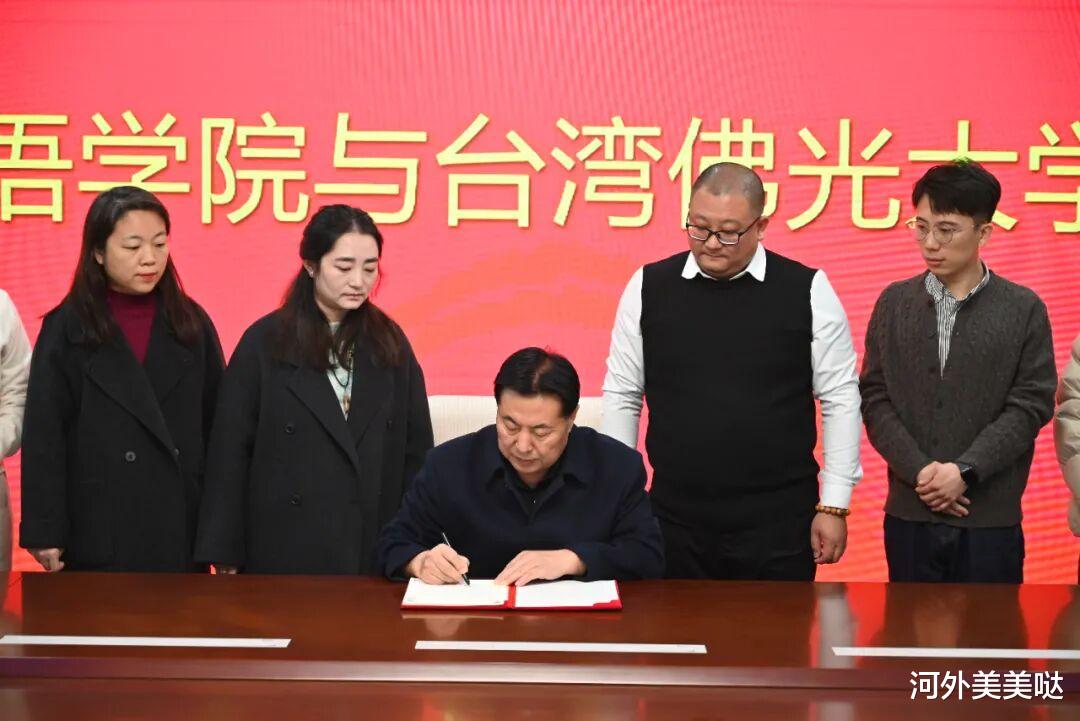 2026年3月5日,新学期伊始,河北外国语学院与台湾佛光大学正式签约。河北外国语学院董事长、校长孙建忠院士与台湾佛光大学校长赵涵捷教授在两校合作协议书上正式签字。两校一致同意:加强师生交流,台湾佛光大学每年接收两名河北外国语学院学生免费赴台学习;加强图书期刊、学术著作及教学研究成果交流;共同举办各项学术活动;共同开展科研合作。台湾佛光大学是河北外国语学院与台湾合作的第6所大学。