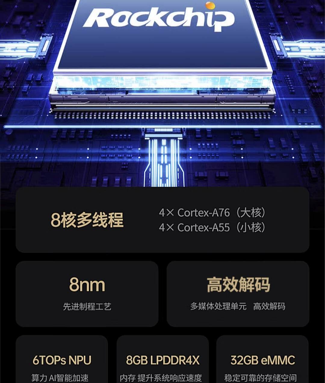 为了方便大家查找照片,绿联DH4300 Plus采用了一枚ARM架构八核处理器,其中一核为NPU(6TOPS算力)。NPU是神经网络处理单元,专为AI计算设计,能高效处理图像识别、语义分析等任务。