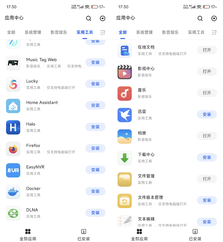 应用中心是让这台NAS“变好玩”的关键,除了绿联官方自带的照片、影音、文件管理这些核心功能,还能下载各种经典的实用工具:比如Transmission下载器、Plex/Jellyfin影音服务器等等。