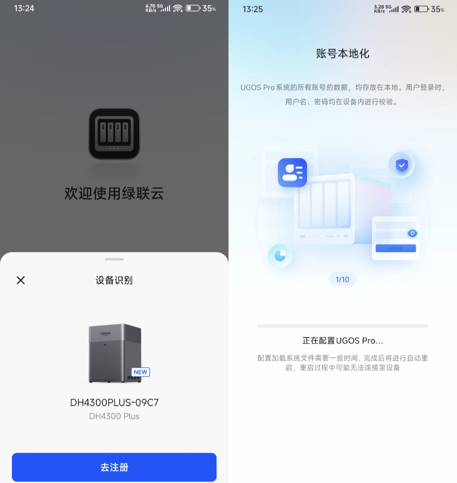 下载注册后,让手机和绿联DH4300 Plus处于同一局域网内,打开手机的NFC功能,往主机正面一贴,自动配对连接,弹出注册引导。进入系统以后,机器会自动配置UGOS Pro系统文件,整个过程如同使用蓝牙一样简单。