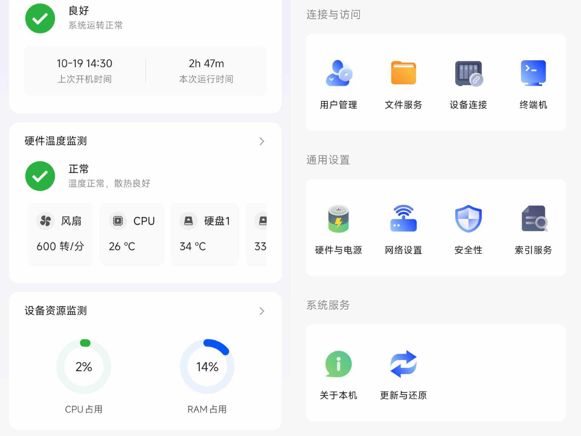 CPU忙不忙、内存用了多少、网络快不快、硬盘还剩多少空间,都在主页显示,产品状况一目了然。控制面板也没有冗杂繁琐的步骤,主打一个简洁明了。