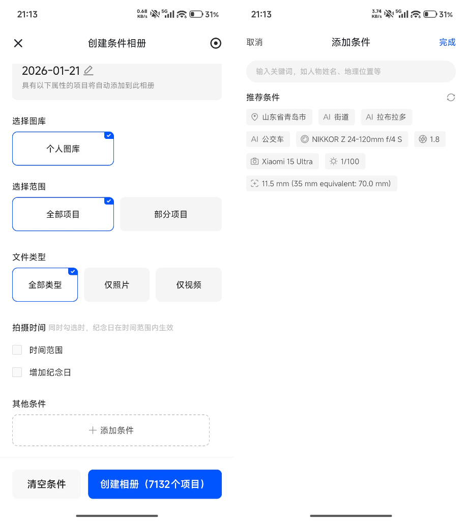 除了宝宝相册我们还可以创建普通相册,甚至可以创建条件相册,可以用地点、拍摄器材、快门速度等限制条件创建符合自己要求的专属相册。