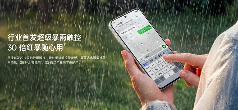 Pro能够在屏幕表面完全覆盖水膜的情况下,依然精准识别用户的指尖指令。官方数据显示,即使在模拟30倍红色暴雨标准的极端淋雨环境下,用户也能秒回消息、顺畅滑动,彻底打破了“雨天不敢用手机”的尴尬局面。