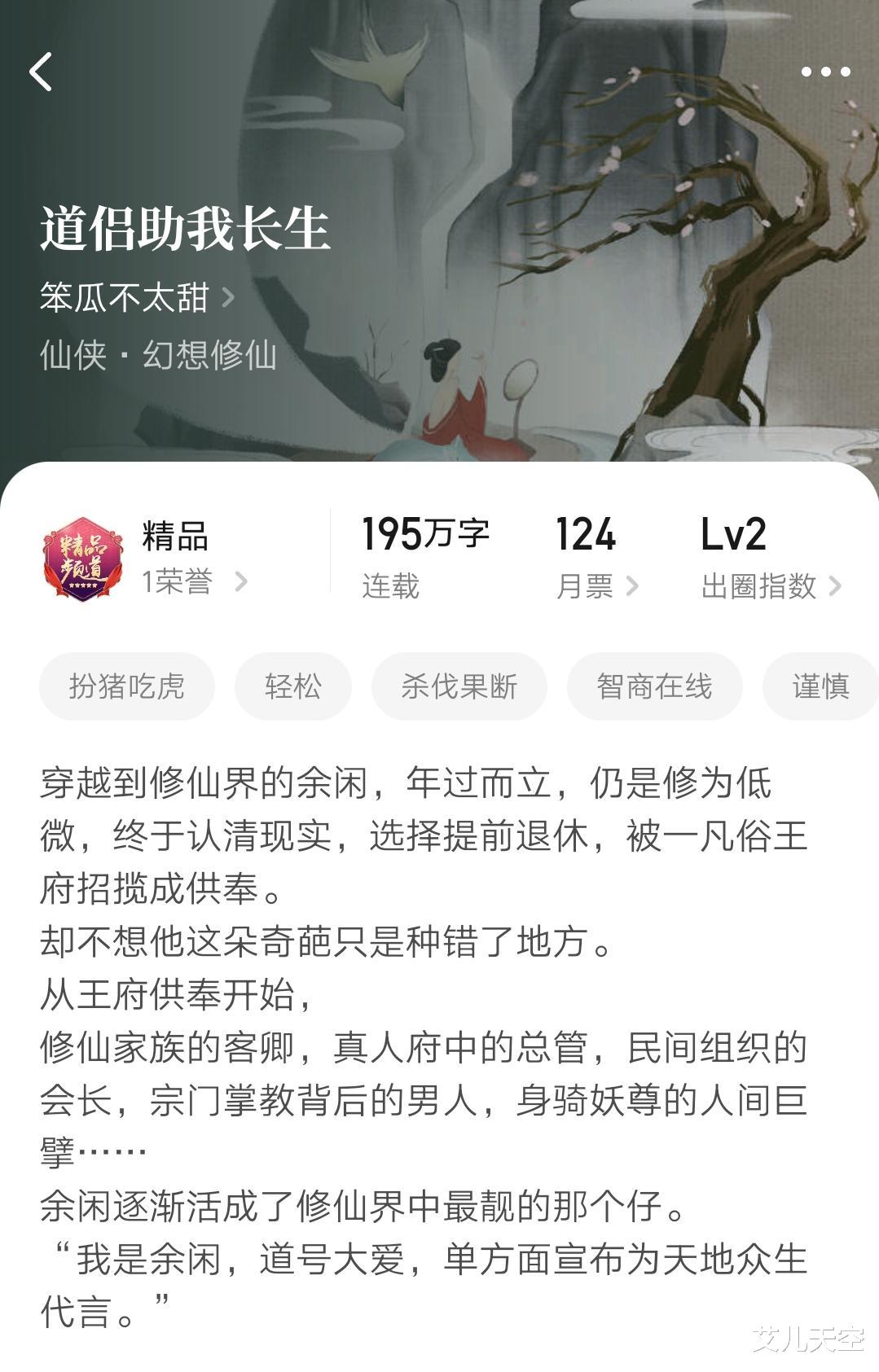 小说也是那种娶妻双修类的修仙文,话说这个题材的热度确实已经过去了。主要是本身也不太好展开,稍不注意就容易进小黑屋,能写到最后的也多不容易。
