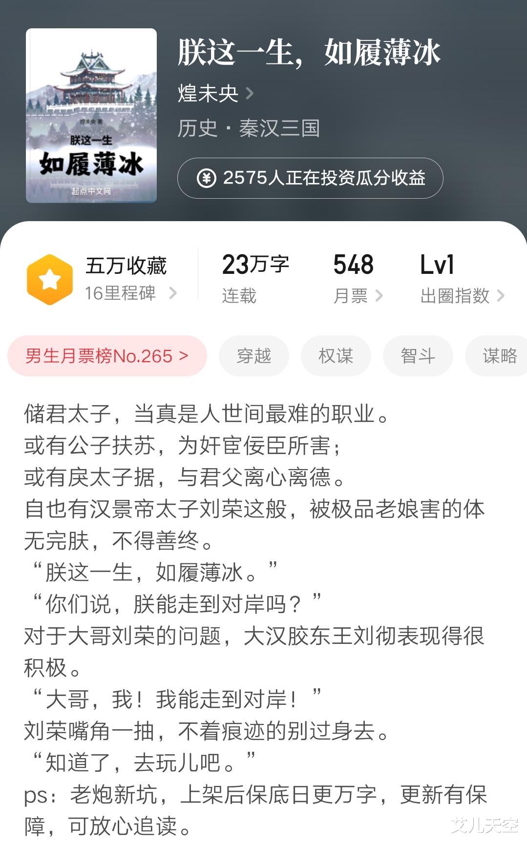 作者“煌未央”是《朕真不是中山靖王啊》作者“血狸奴”的马甲,作者在上架感言里承认过了。前作因为过于放飞自我被封了,这次新书《朕这一生,如履薄冰》的名字估计也是对前作的警醒了。
