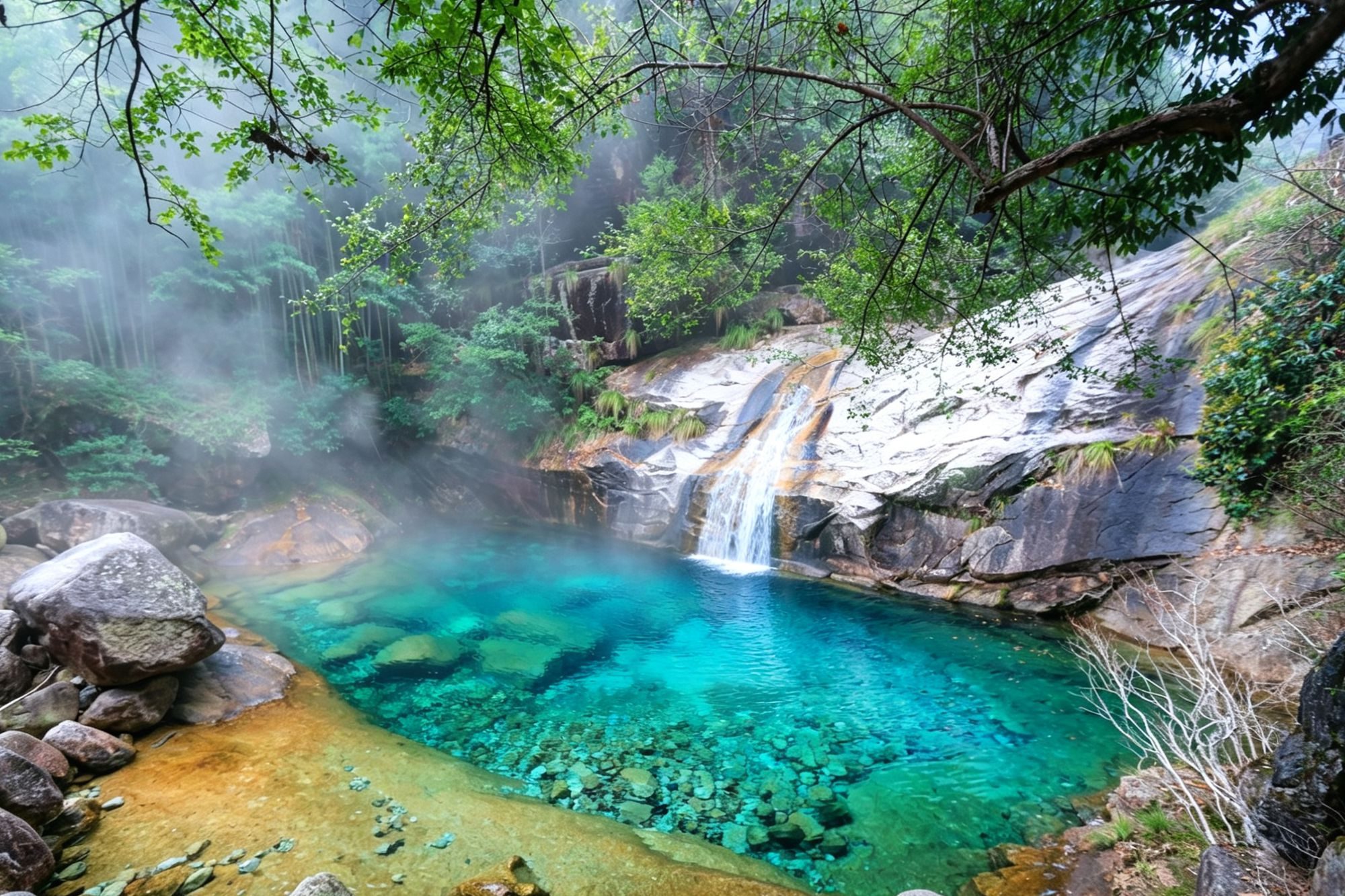 溪水带着凉意从岩石间汇入,潭水愈发澄澈透亮,深浅不一的绿在水里晕开,中间的水潭深如墨色,显得格外神秘。