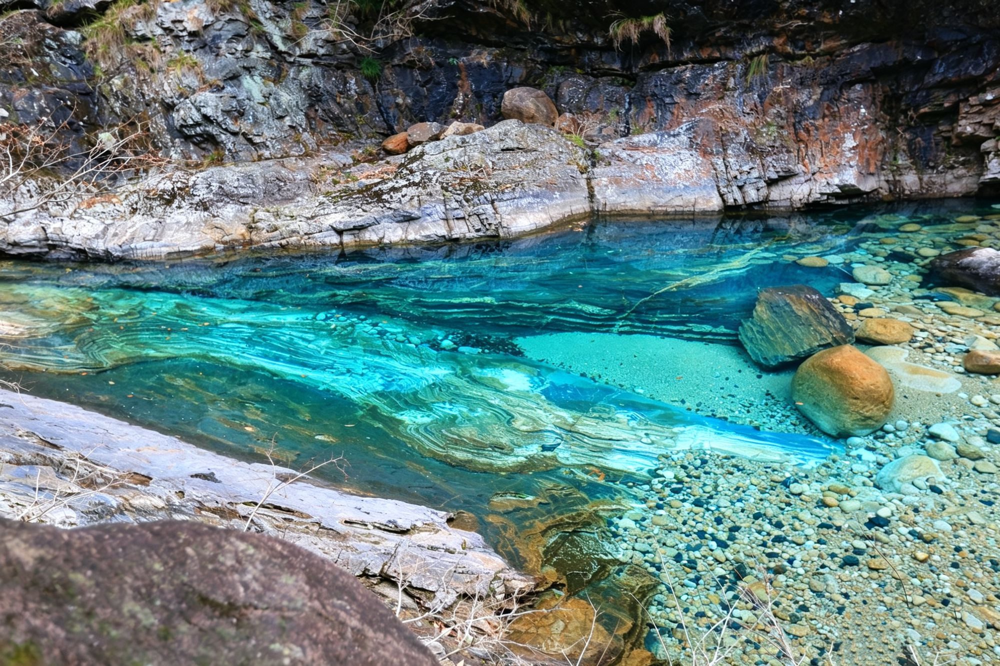 潭边巨石显出古老沧桑的痕迹,更显得潭水一片轻盈。这里的每一座潭水都清澈见底,也都因光线变化和深浅不同而呈现出不同颜色,仿佛一个百变女郎,无论何时来都有不同风情。
