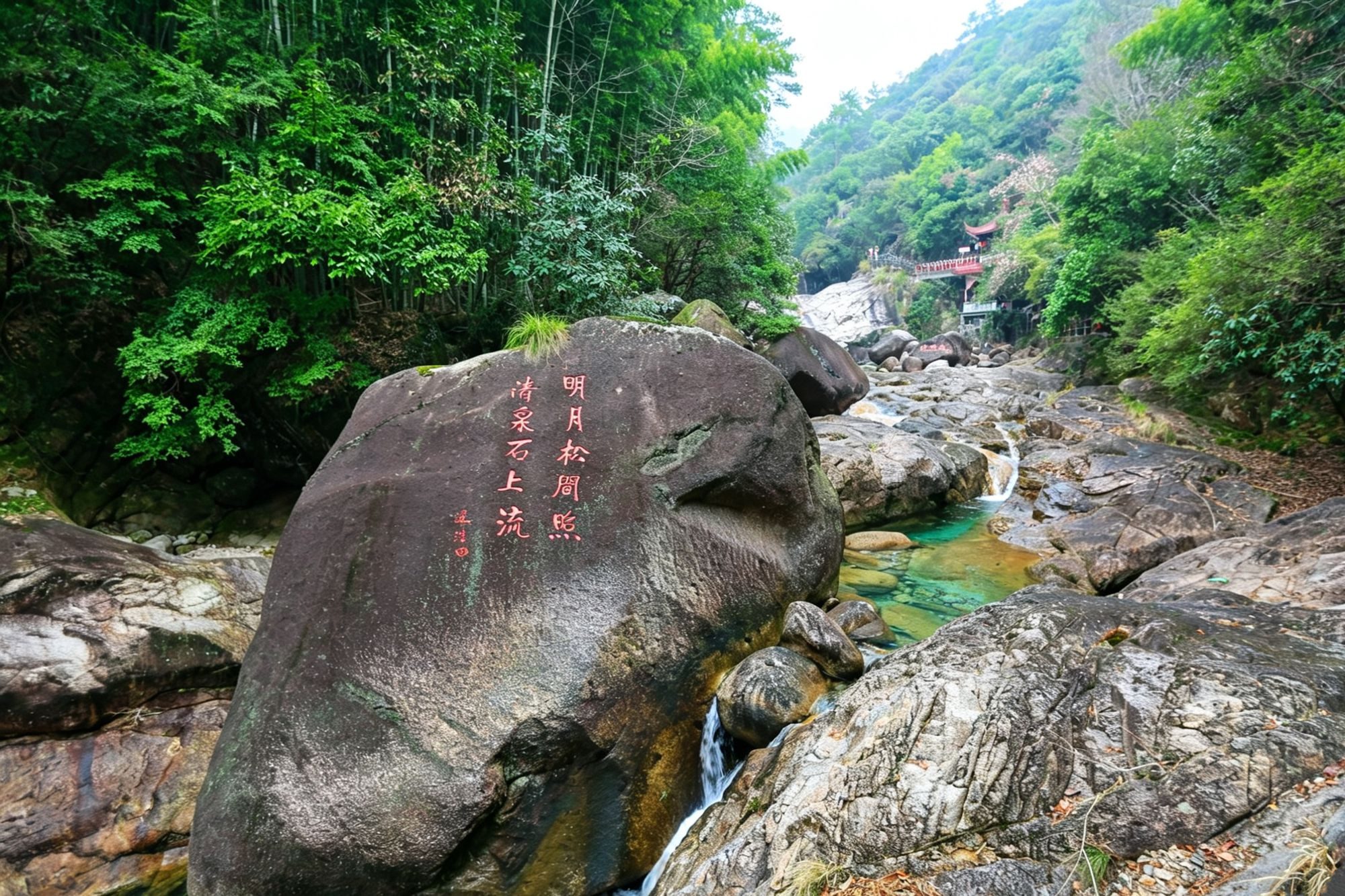溪流顺着岩石流淌,青绿相间,仿佛一条美丽的彩带。两岸竹林绿意盎然,新叶在风里轻摆,这种诗意正是王维“明月松间照,清泉石上流”的真实写照。