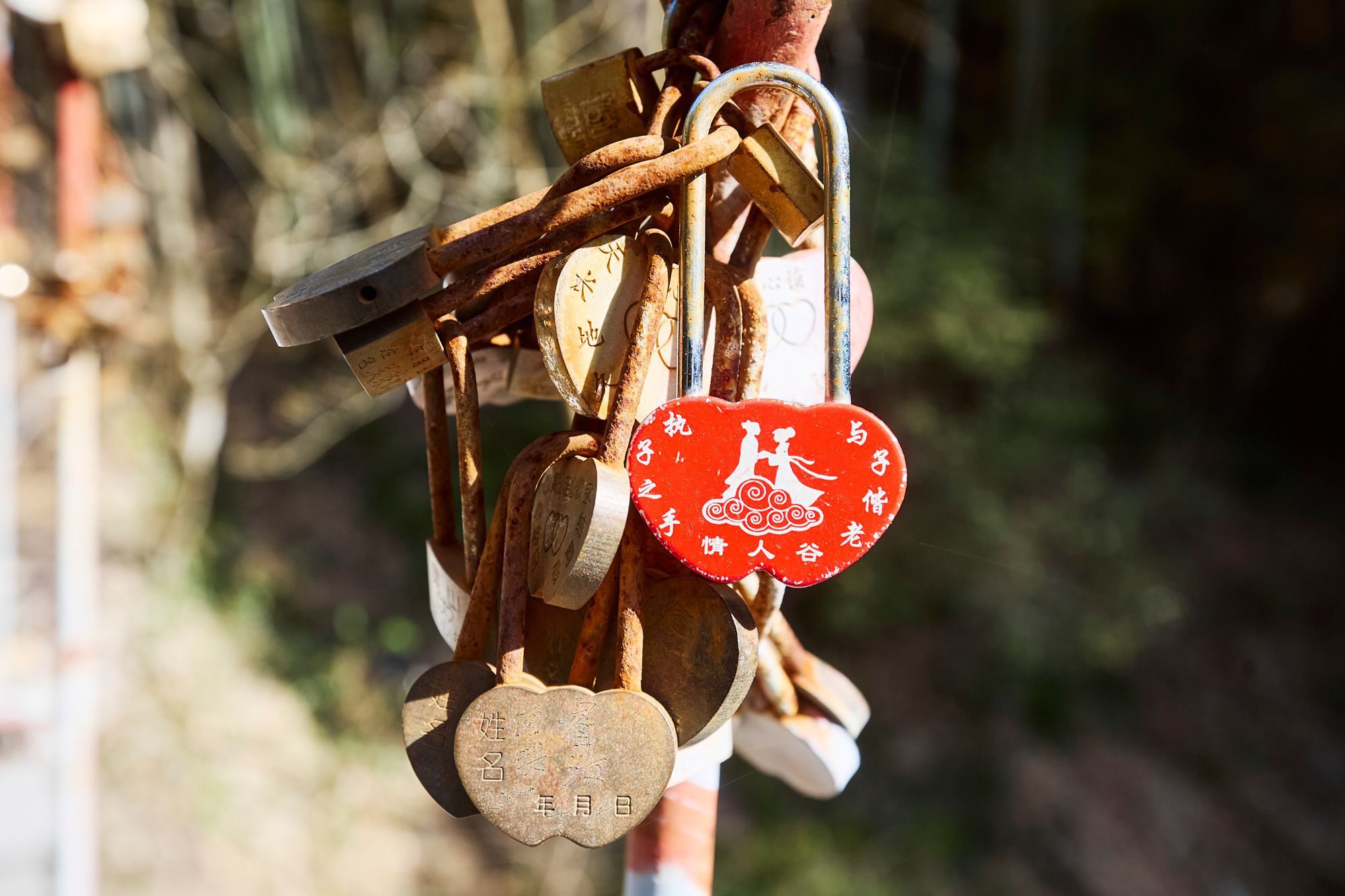 情侣同来一定要走走这座充满仪式感的“情人桥”,桥面刻着“一步相遇、两步相识、三步相知、四步相爱”的字样,红绸在风里轻飘,走在上面仿佛走进一条通往浪漫的通道。