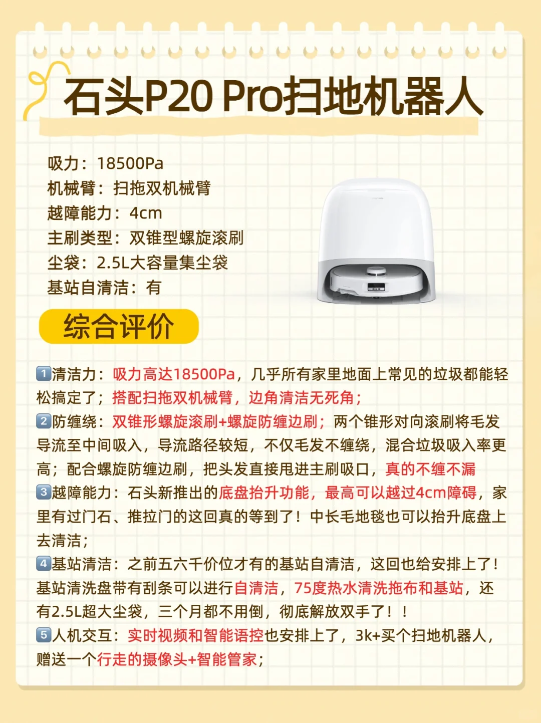 综合考虑下来我选择了石头P20 Pro,家里的阳台有个推拉门槛,现在在用的扫地机通过比较费劲,时常需要用脚助力一下,希望这回能彻底实现扫地机器人全屋清洁。