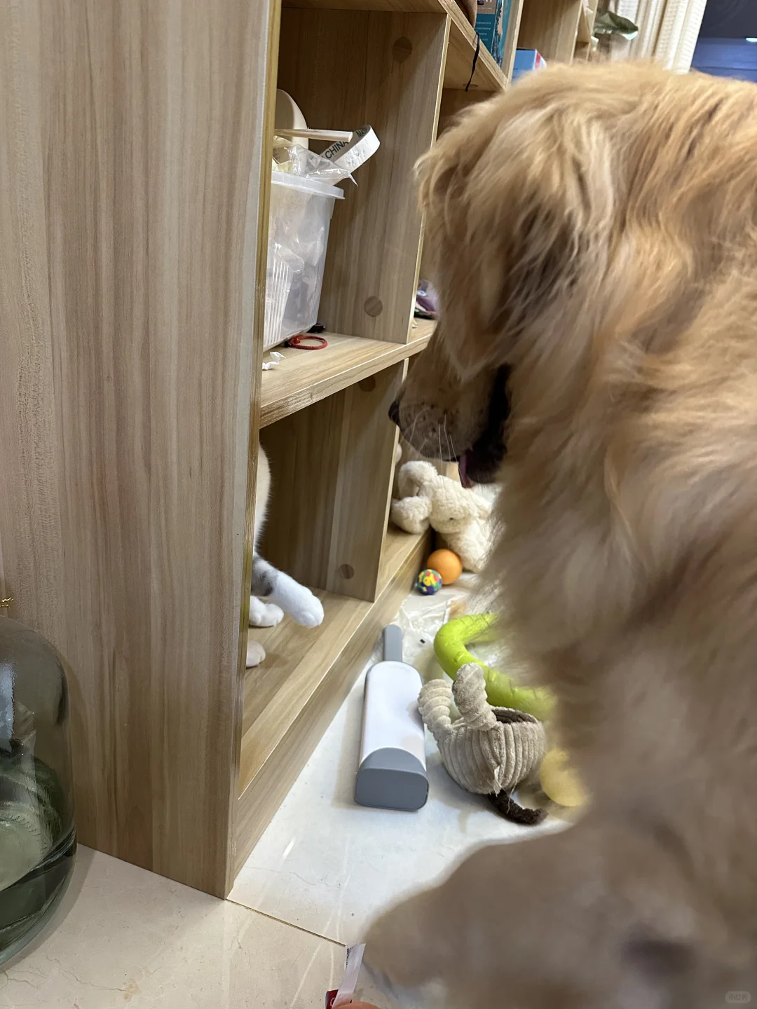 我家两只猫都不是很粘人 但是她们都会主动去蹭我家大宝金毛猪猪 撒娇