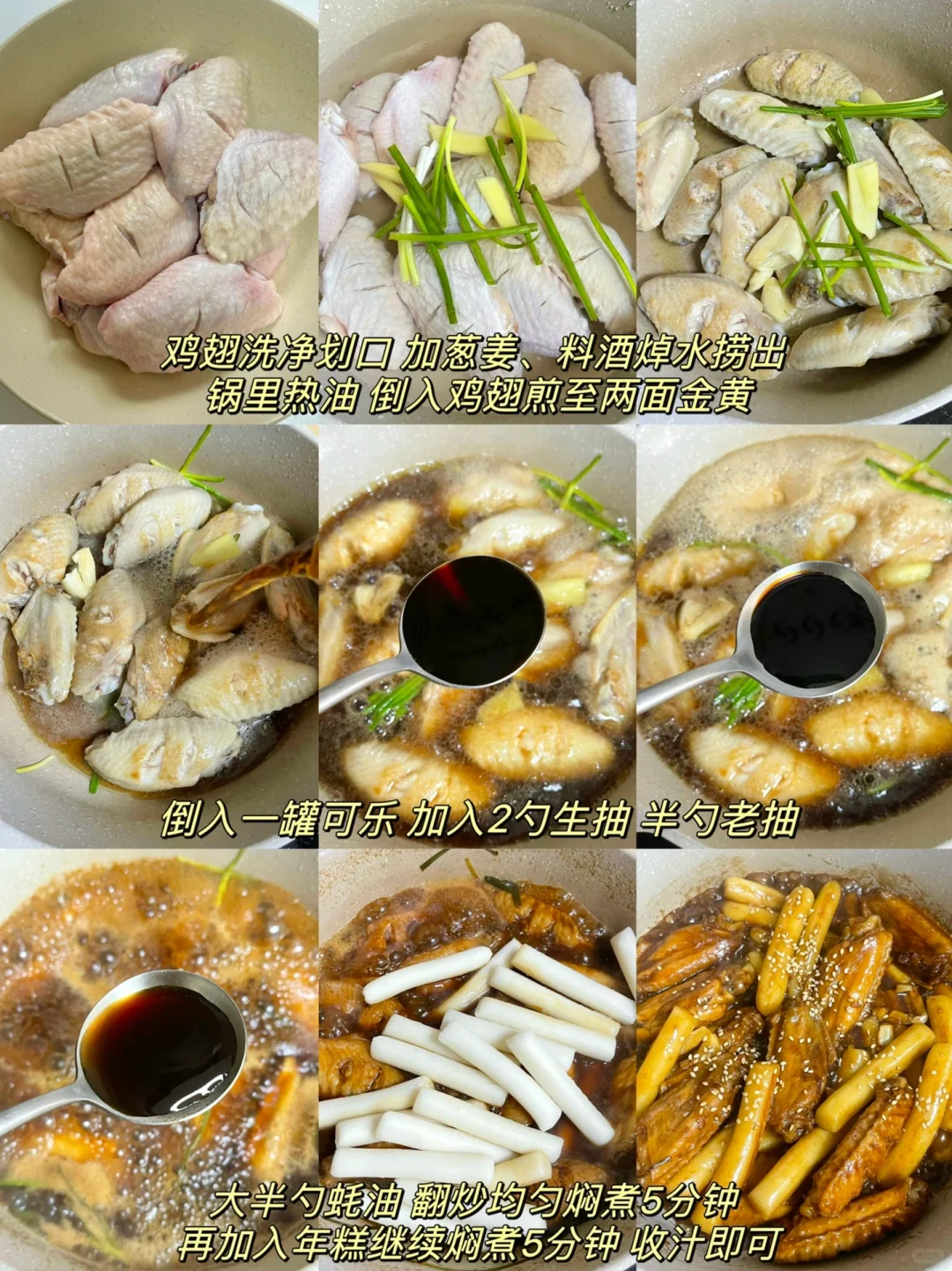 ☑️鸡翅划口 年糕洗净 热锅冷油把鸡翅煎制双面金黄 加入葱姜蒜煸炒出香味