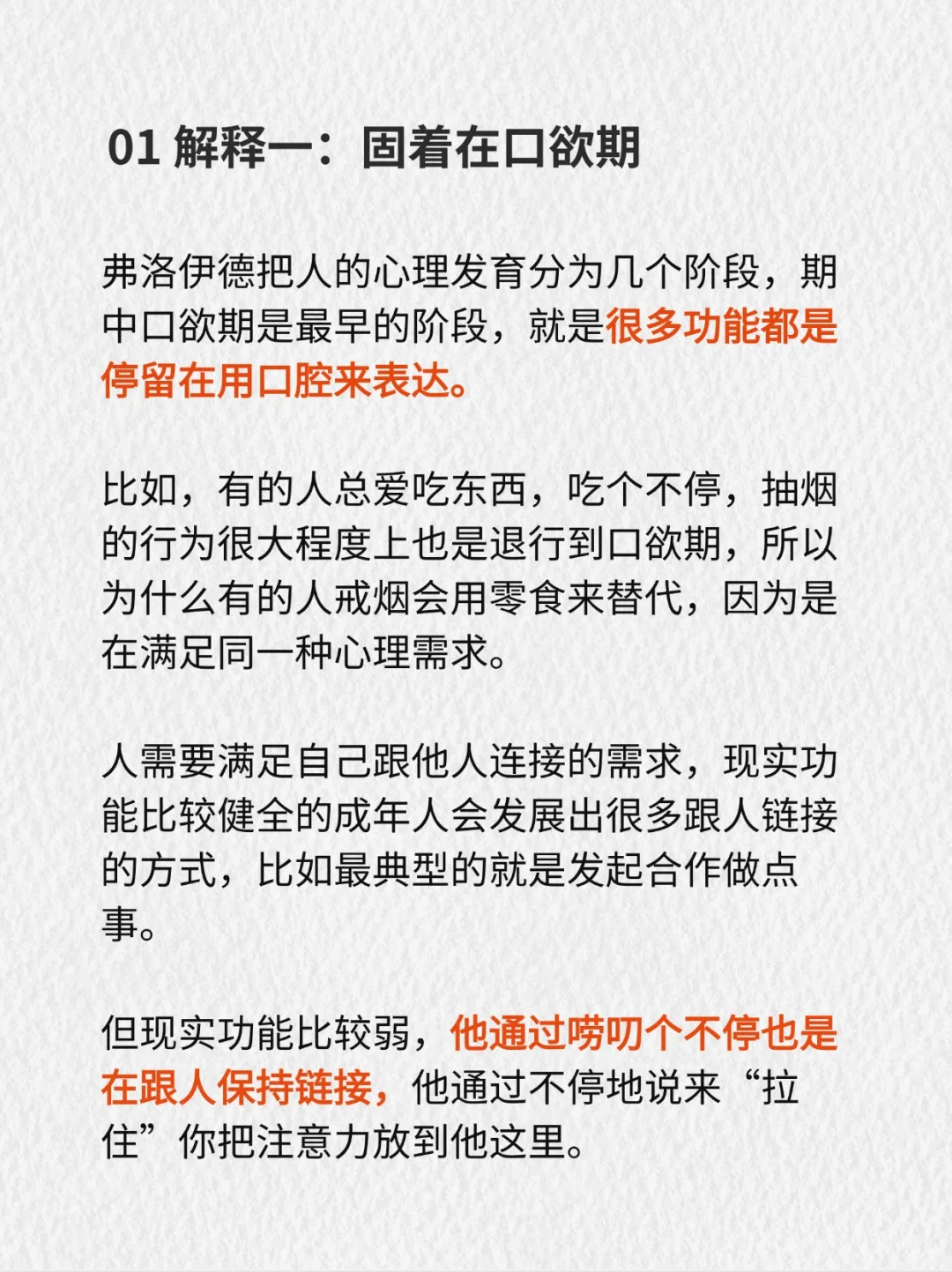 但现实功能比较弱,他通过唠叨个不停也是在跟人保持链接,他通过不停地说来“拉住”你把注意力放到他这里。