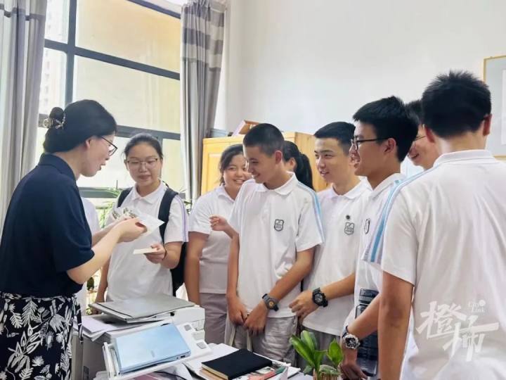 同学们收到通知后,非常开心。今天下午,很多原来初中是同个班的,或者原来初中是同个学校的同学,带着学军中学的文创产品等小礼品,结伴去看望初中母校老师。