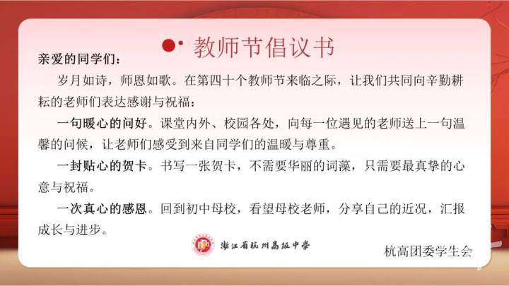 此外,杭高团委学生会,也向全体学生,发出了教师节的倡议,让大家回初中母校,看看老师,分享下自己的近况,汇报成长与进步。