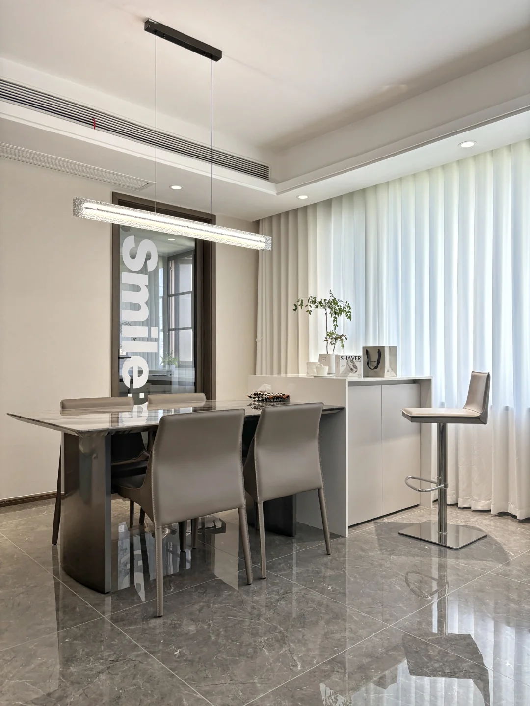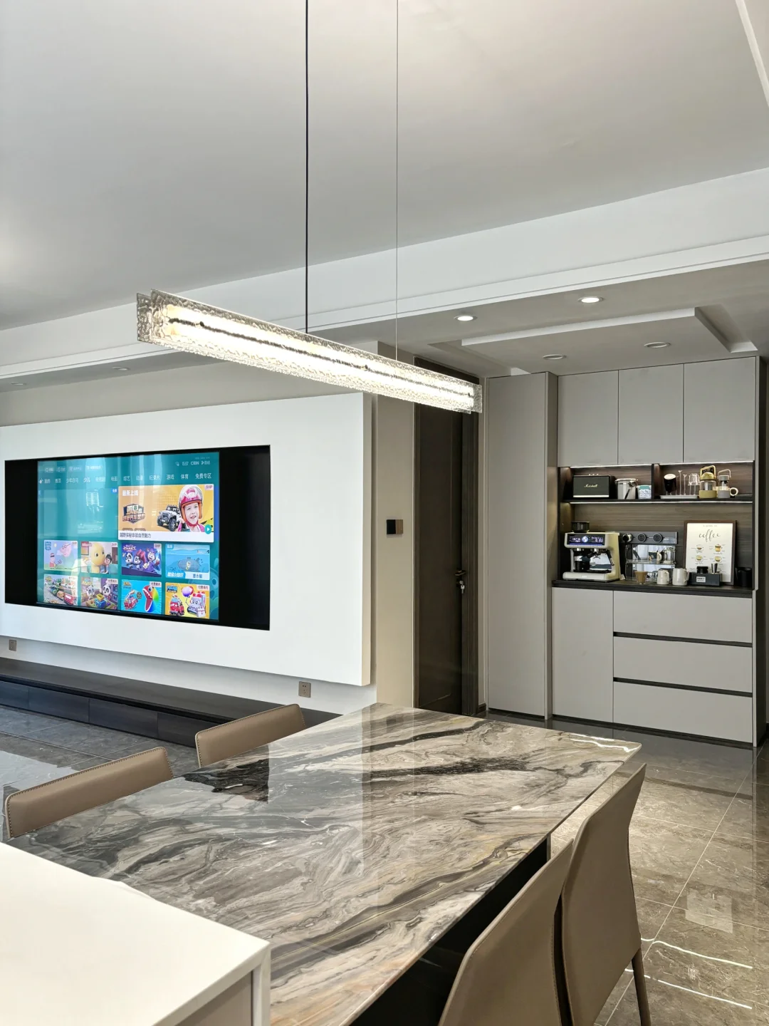 我家是客餐厅一体的极简风横厅户型🏠,餐边柜布置成了咖啡角,餐厅做的分体式岛台餐桌设计,岛台朝外一侧柜体做了内缩,搭配吧台椅可以兼具水吧台功能,平时可以在这边喝喝咖啡办办公。