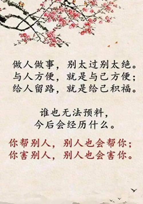 人生如棋,落子需谨慎,落子无悔却需留眼。处事之道的大智慧在于:不把事做绝,不把话说满,即是宽容他人,亦是成全自己。人间万事皆有度,过则为灾,不如无。常言道:做人留一线,日后好相见。做人做事不要太绝,否则等于自掘坟墓,既伤了他人,也断了自己的后路。
