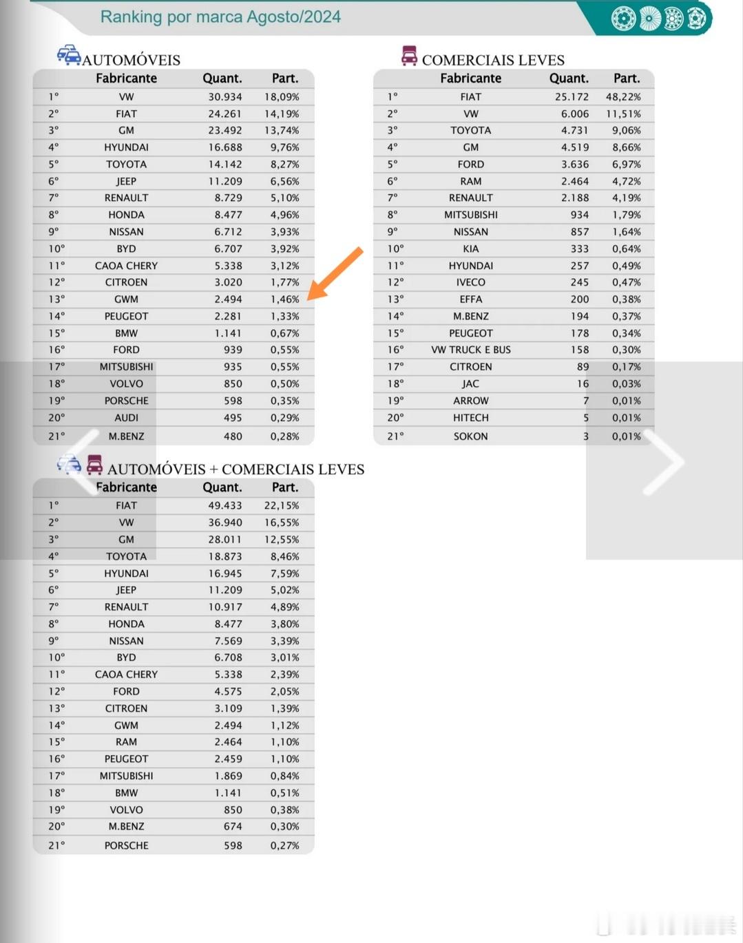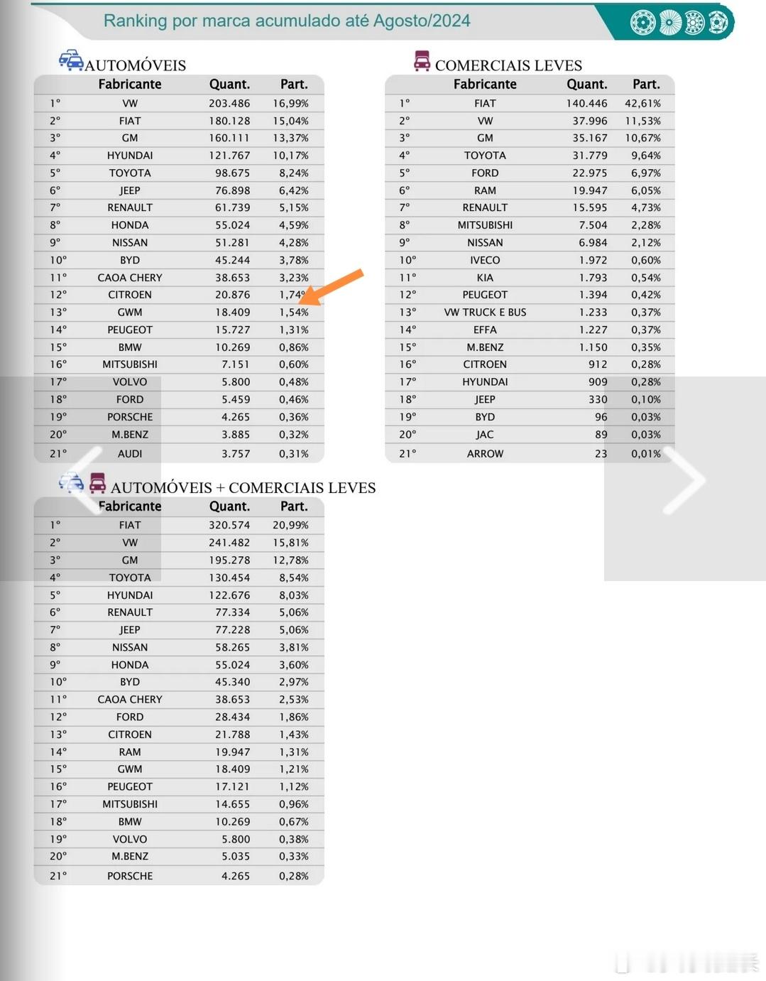 2024年8月,巴西市场销售商品车23.7万台,其中乘用车17万台,轻商5.2万台