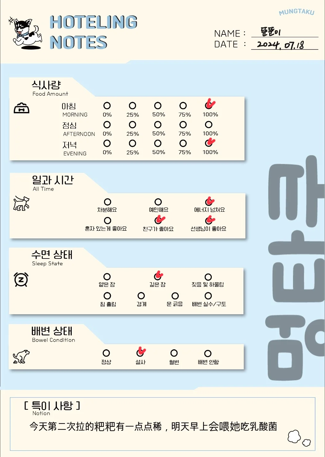 📋最让我感动的是,每晚我都会收到一份墩墩的“日报”,包括她的精神状态、食欲、排便情况等,哈哈哈,真的是“屎”无巨细!