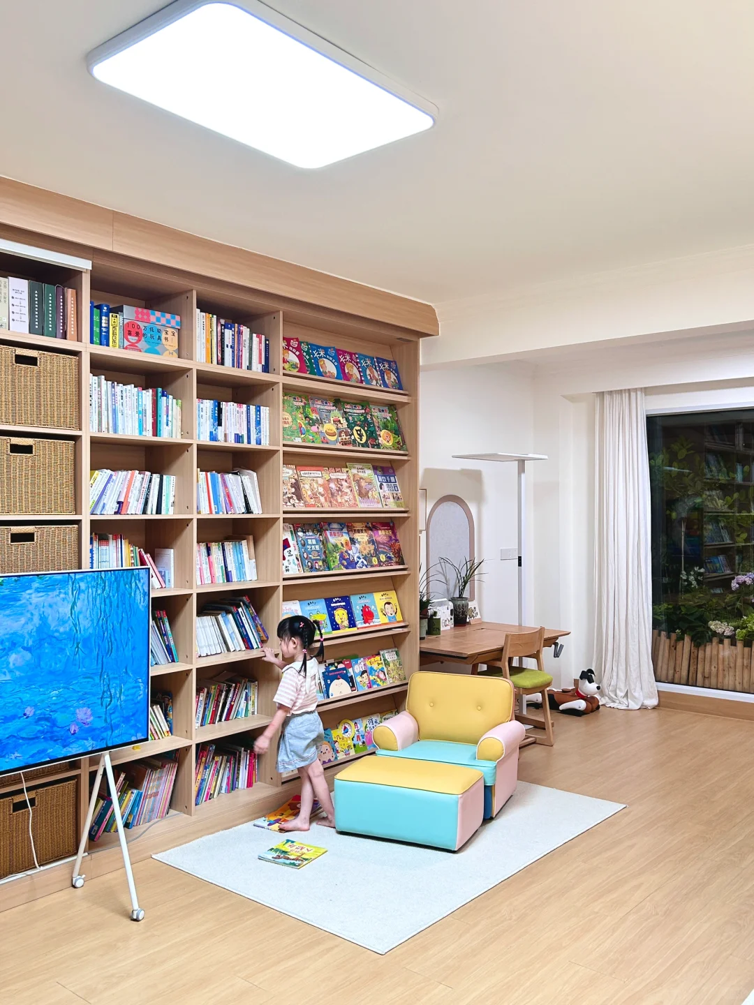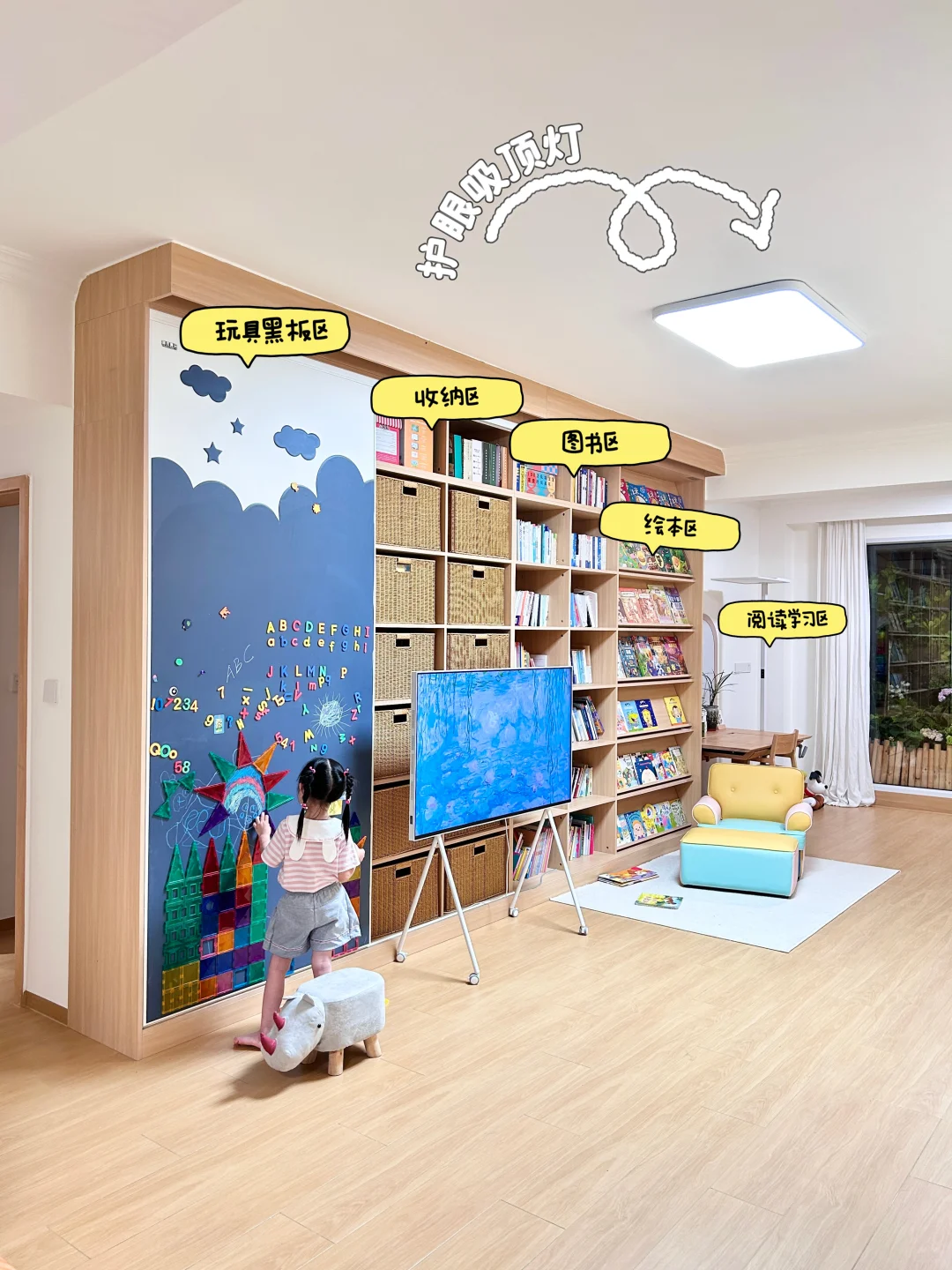分了玩具收纳黑板区、杂物收纳区、📚图书区、绘本区、阅读学习区。分区很实用,有娃家庭可参考。