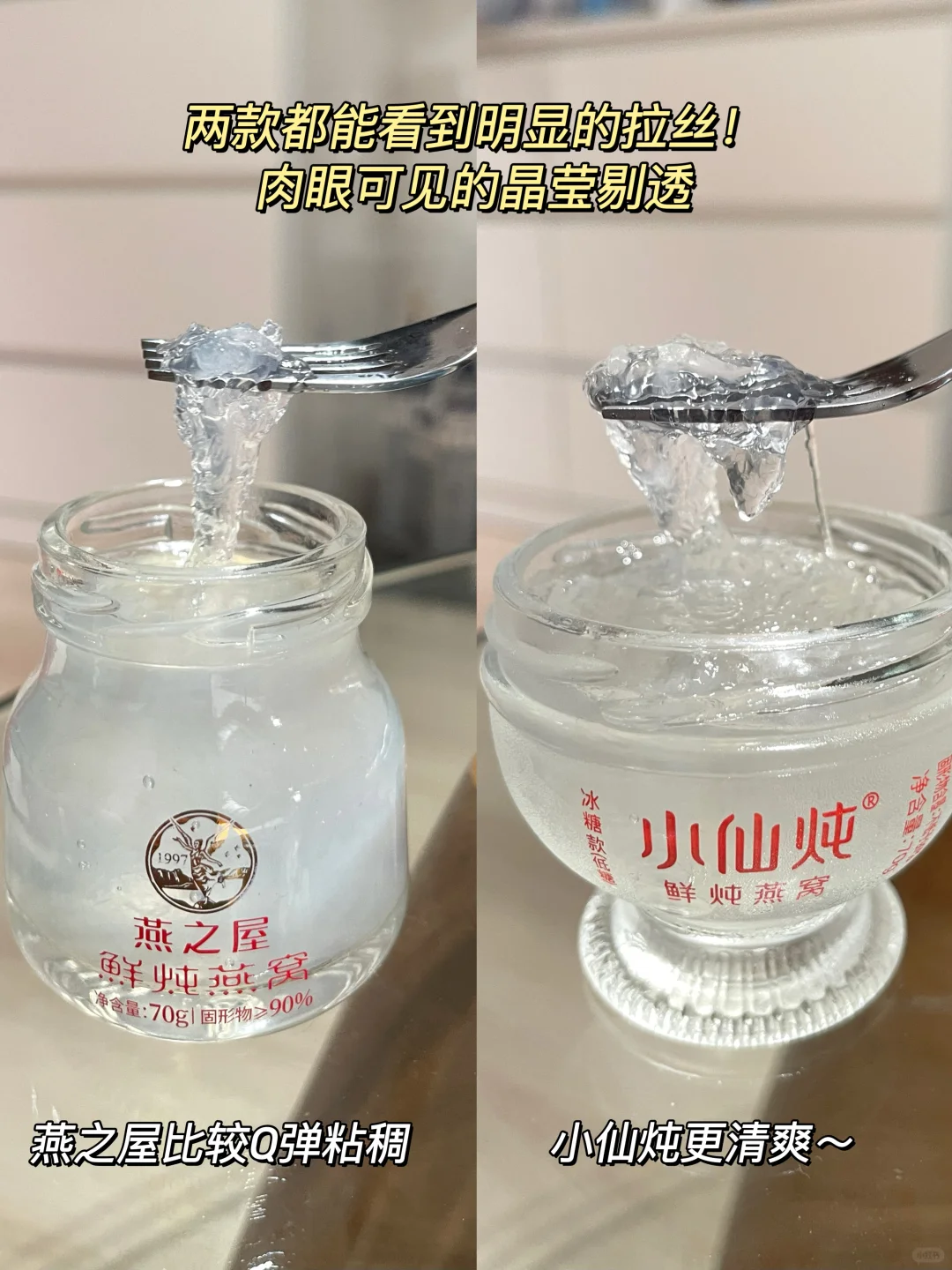 其实两款的质地和口感都不错,肉眼可见的晶莹剔透,用勺子一挖就能明显看到拉丝。对比起来燕之屋的燕窝会更加Q弹黏稠,小鲜炖的口感接近炖煮燕窝,清清淡淡的~