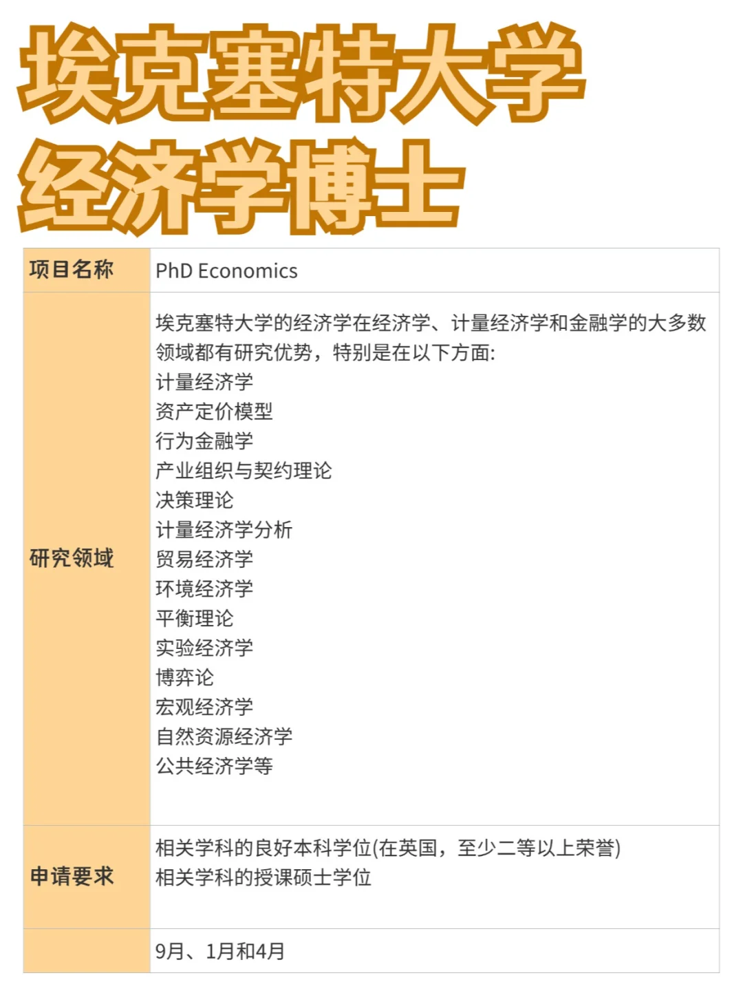 【项目名称】 PhD Economics 【研究领域】 埃克塞特大学的经济学在经济学、计量经济学和金融学的大多数领域都有研究优势,特别是在以下方面: 计量经济学 资产定价模型 行为金融学 产业组织与契约理论 决策理论 计量经济学分析 贸易经济学 环境经济学 平衡理论 实验经济学 博弈论 宏观经济学 自然资源经济学 公共经济学等 【申请要求】 相关学科的良好本科学位(在英国,至少二等以上荣誉) 相关学科的授课硕士学位 【开学时间】 9月、1月和4月