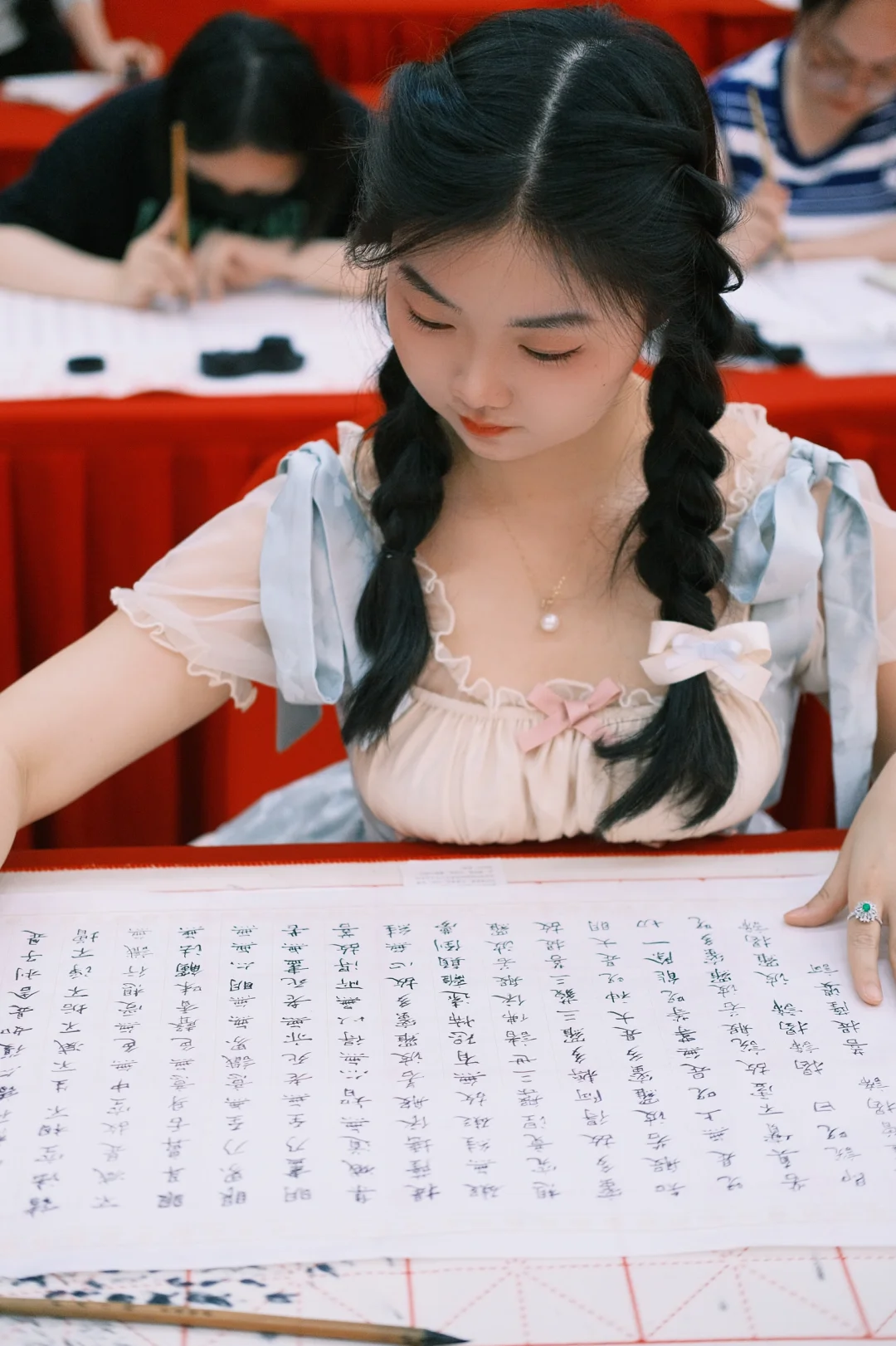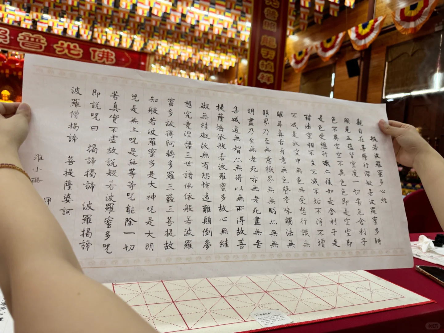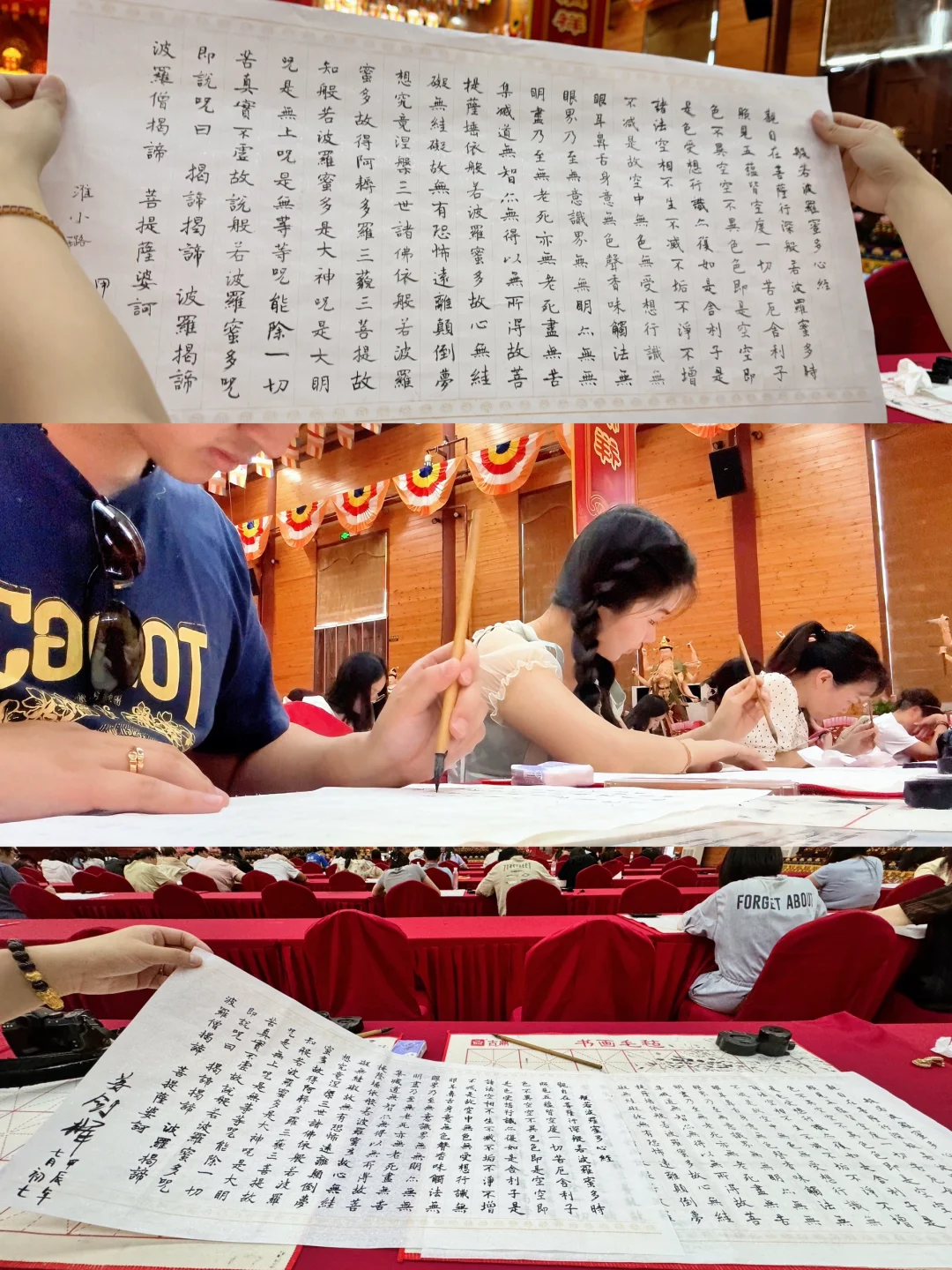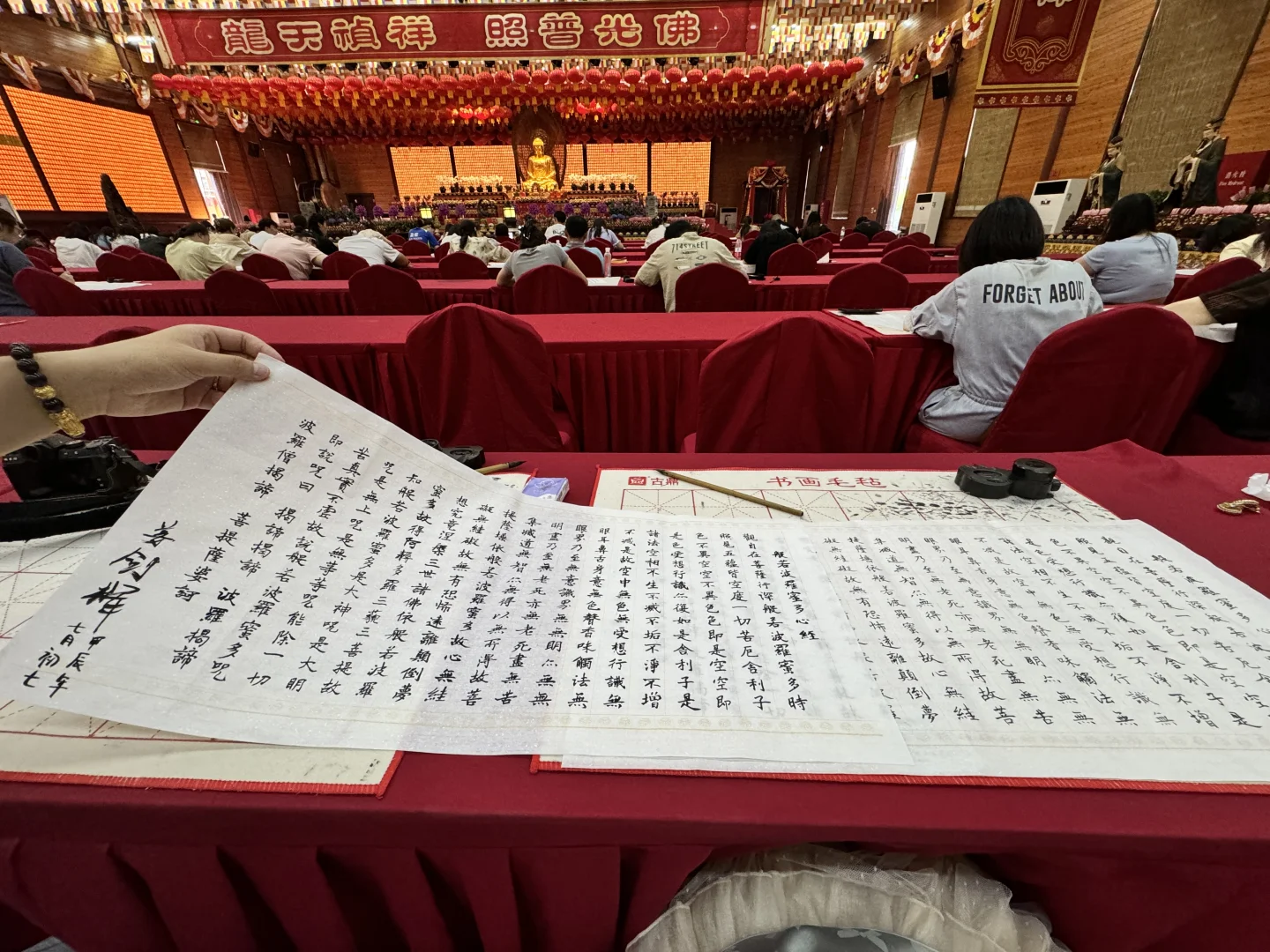 ⛩️抄经:龙华寺算是市中心闹中取静的好去处了,有一个很大的佛堂专门供香客们抄经,有义工为大家免费提供纸、墨、砚台等抄经工具,纸上有拓印好的经文供临摹,净手净笔后就可以抄经啦。