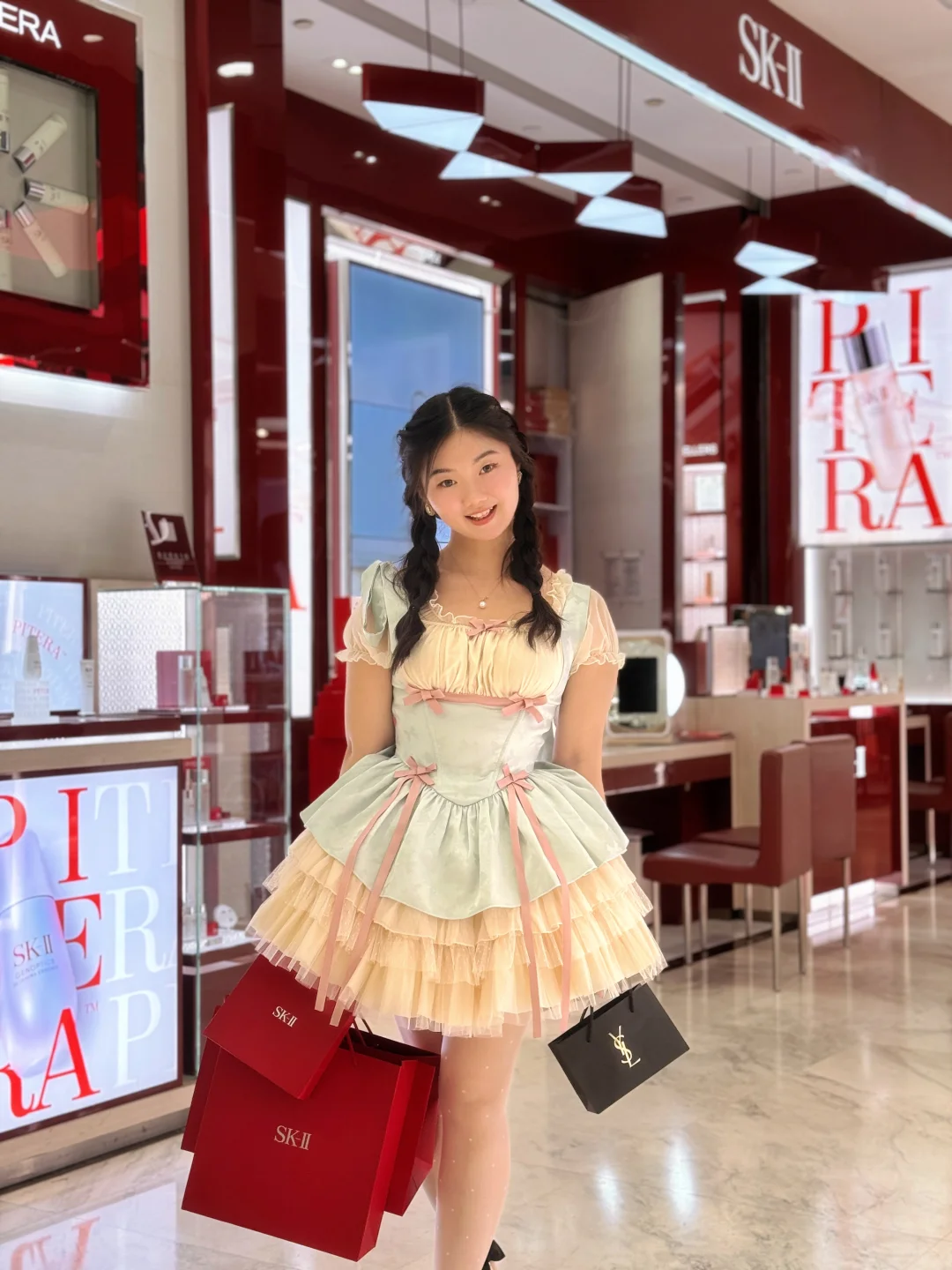 🛍️Shopping:吃完饭已经很晚了,火速前往百盛扫货,本来想买一支香奈儿唇釉,没想到当天所有色号居然全部售罄!老公为了安抚我,转头看到SK2,说没事,我们买神仙水[色色R]sk2柜姐也很热情,给我和老公都做了肌肤测试,我的肌龄是21,本来还很开心,结果他测出来只有18😦我这天天昂贵护肤品供着的脸居然不如连防晒都懒得涂的!最后买了神仙水➕大红瓶的套盒,叠加商场优惠还是很划算的,还送了很多小样。最后去试了YSL,老网红610上唇太显嫩了,果断拿下!