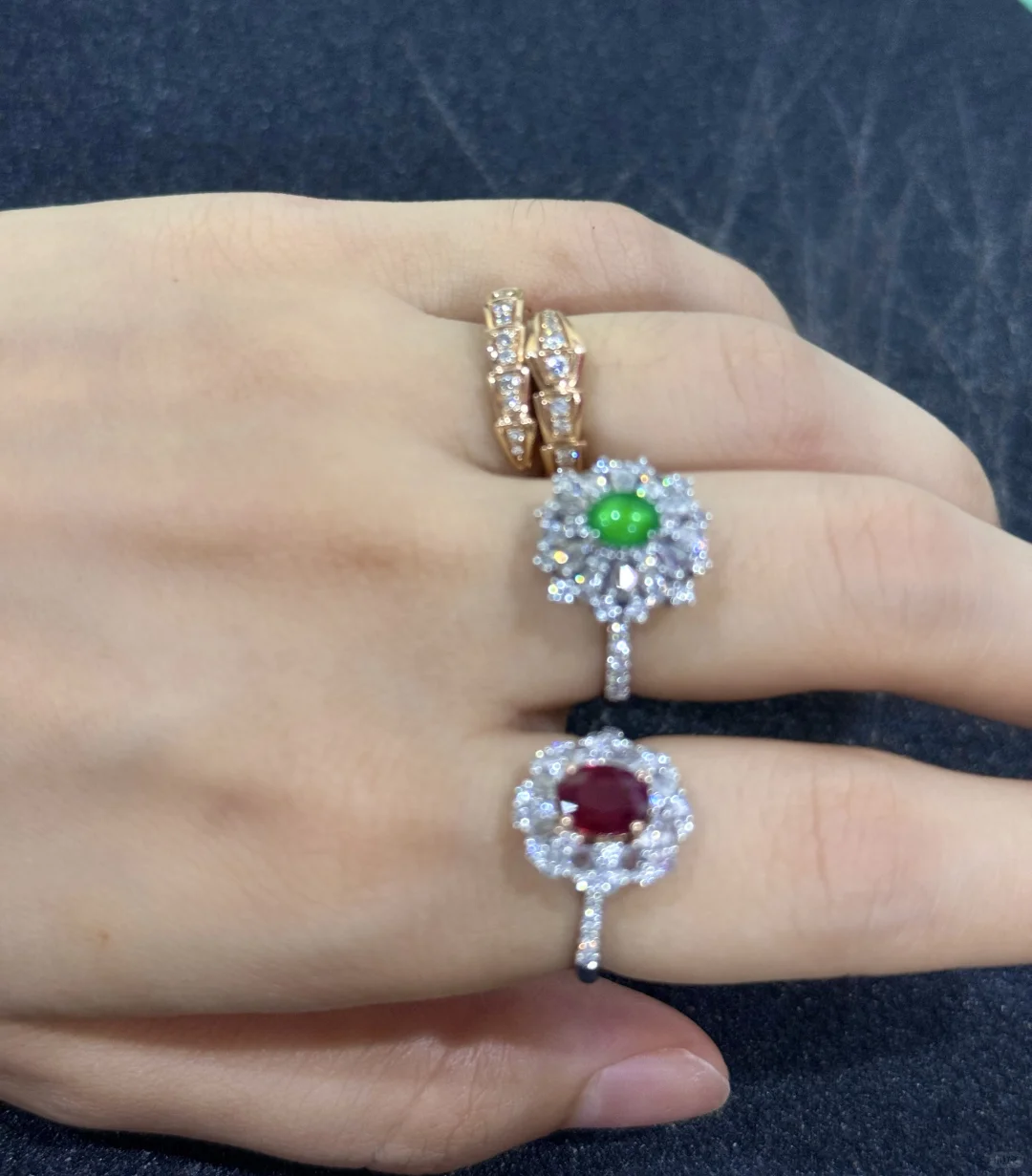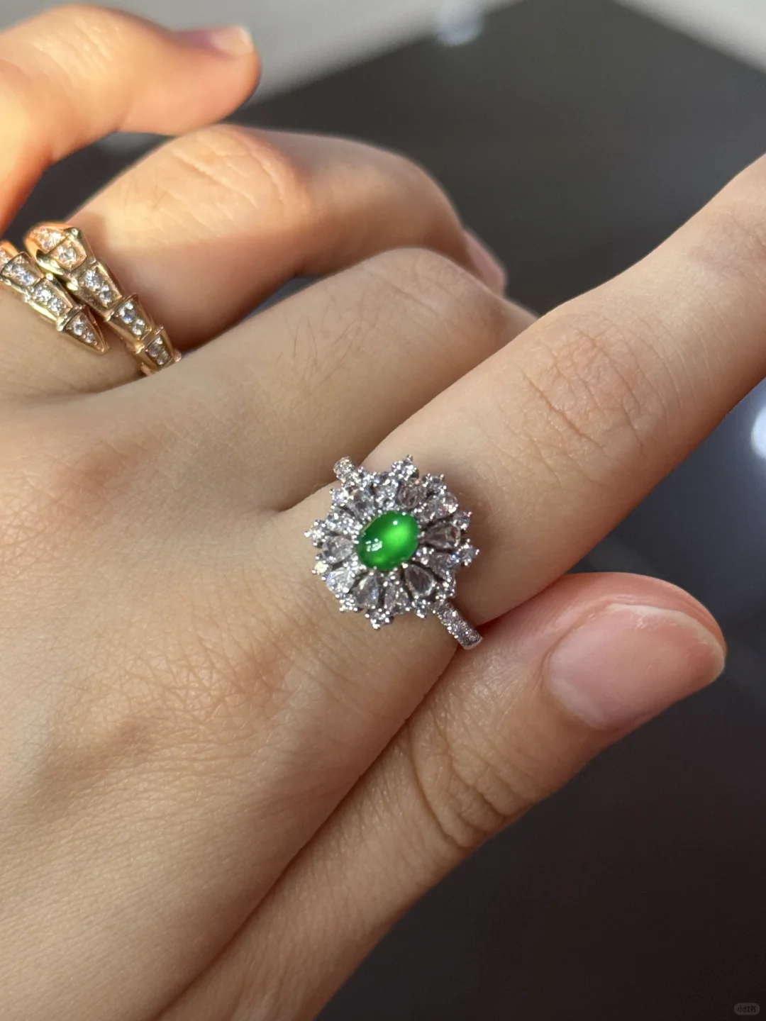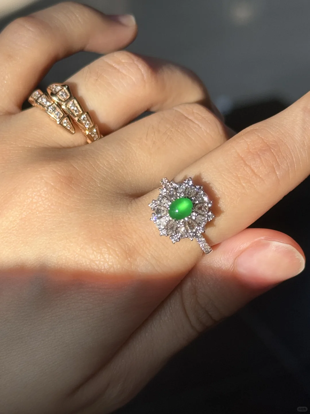 我的入坑小绿蛋,尺寸卡5.5,种水好到炸光,卖家说已经到龙石了,肉眼看和猫眼似的,晚上只要有一点点光线它就能闪耀✨ 颜色是很显年轻手白的黄阳绿,虽小但精,没有任何纹裂棉或杂质,品质算是到顶了[飞吻R]