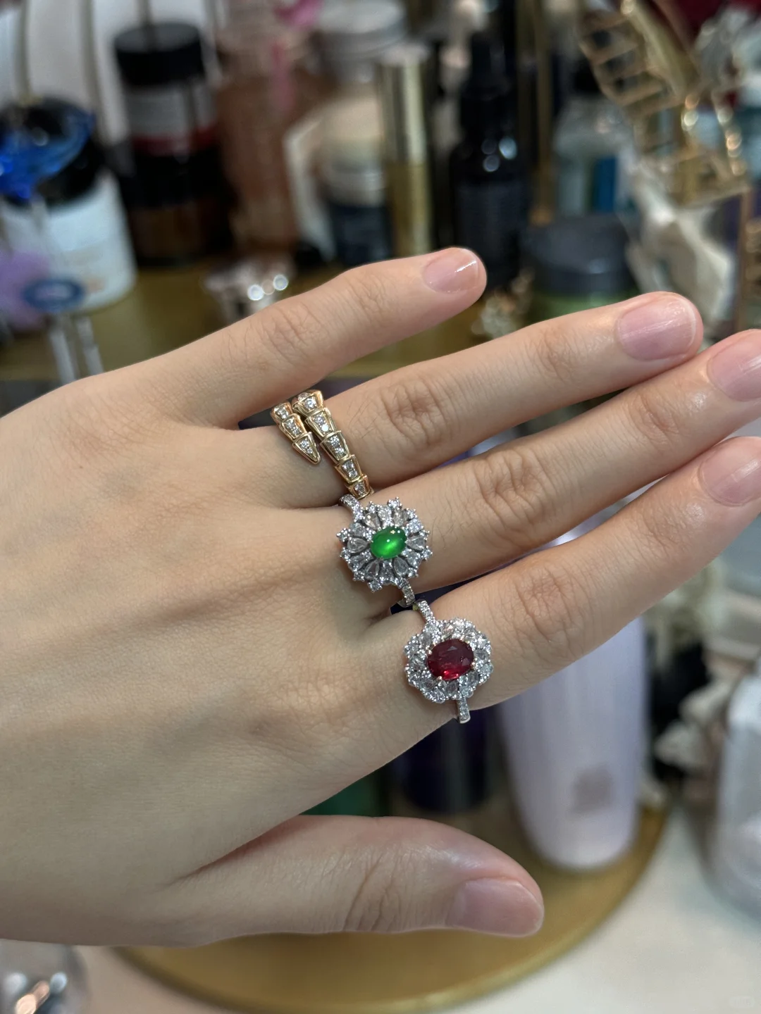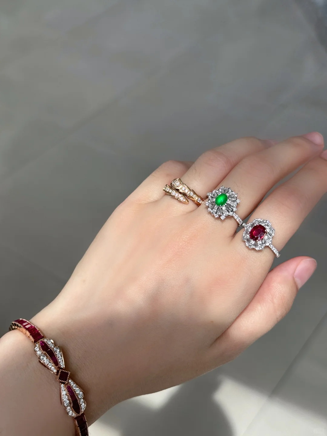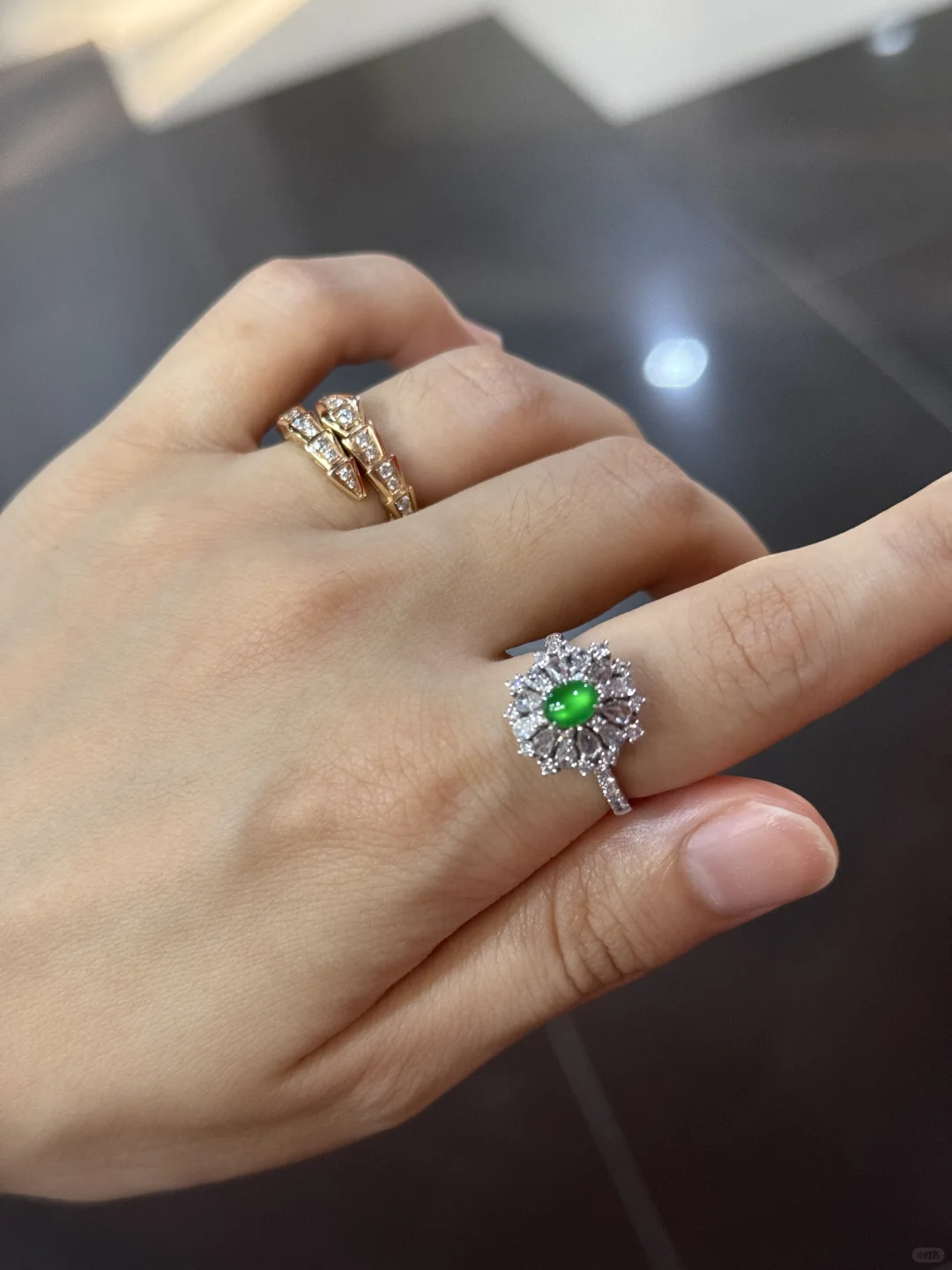 我的入坑小绿蛋,尺寸卡5.5,种水好到炸光,卖家说已经到龙石了,肉眼看和猫眼似的,晚上只要有一点点光线它就能闪耀✨ 颜色是很显年轻手白的黄阳绿,虽小但精,没有任何纹裂棉或杂质,品质算是到顶了[飞吻R]