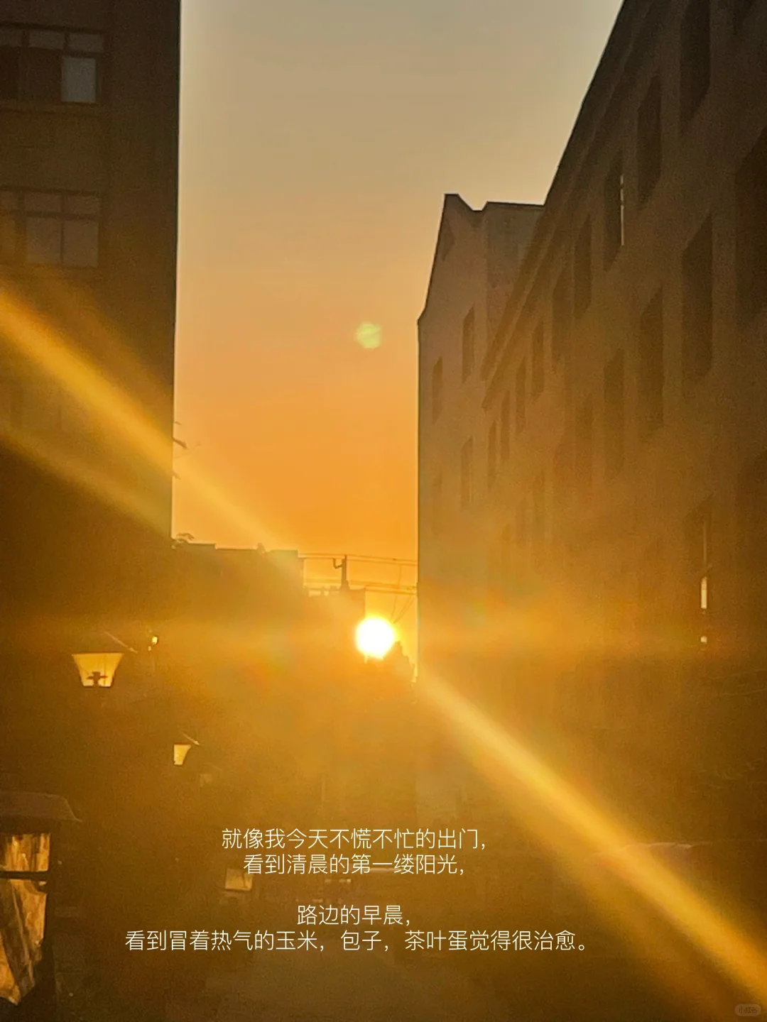 就像我今天不慌不忙的出门,看到清晨的第一缕阳光,路边的早晨,看到冒着热气的玉米,包子,茶叶蛋觉得很治愈。
