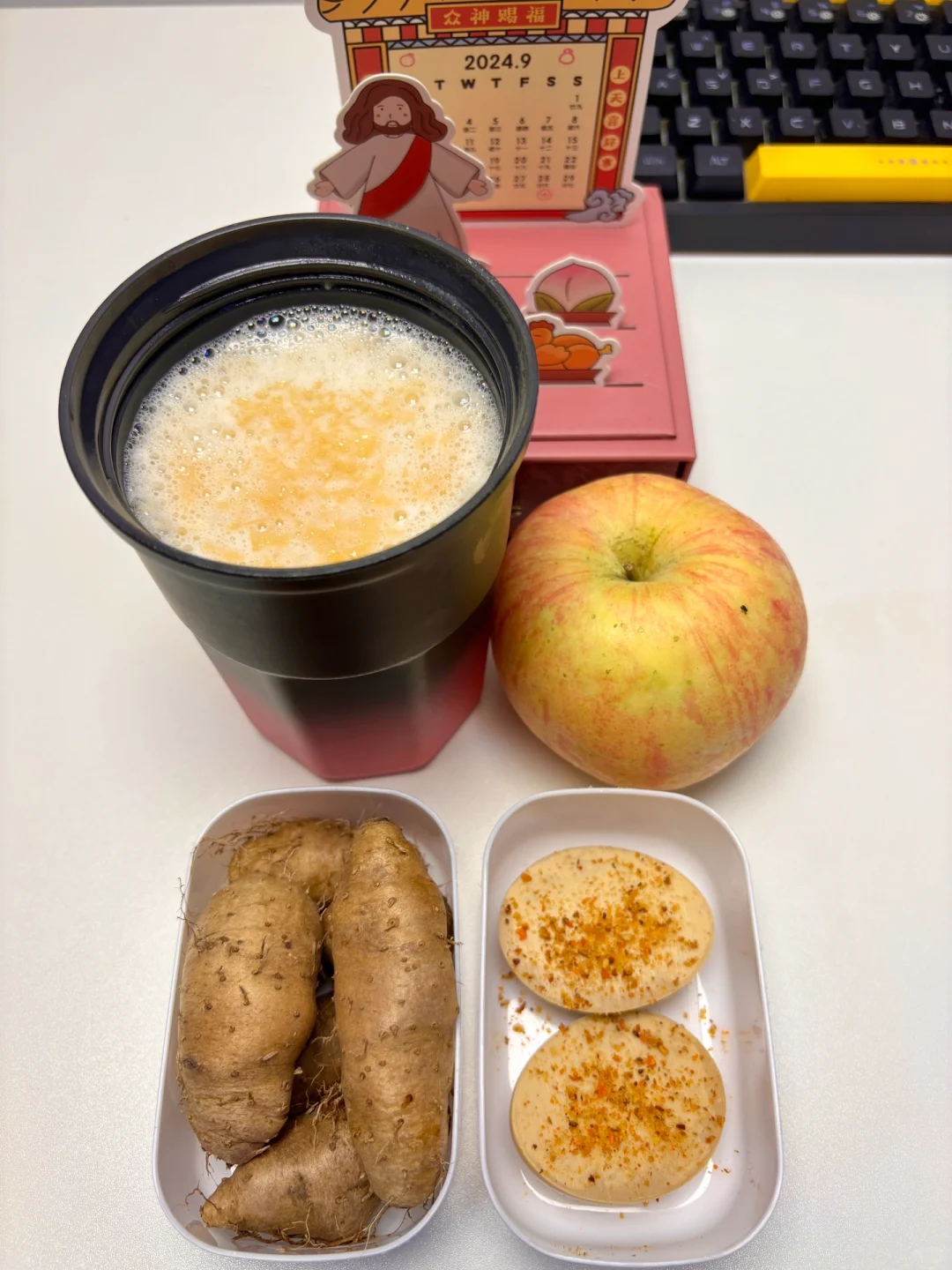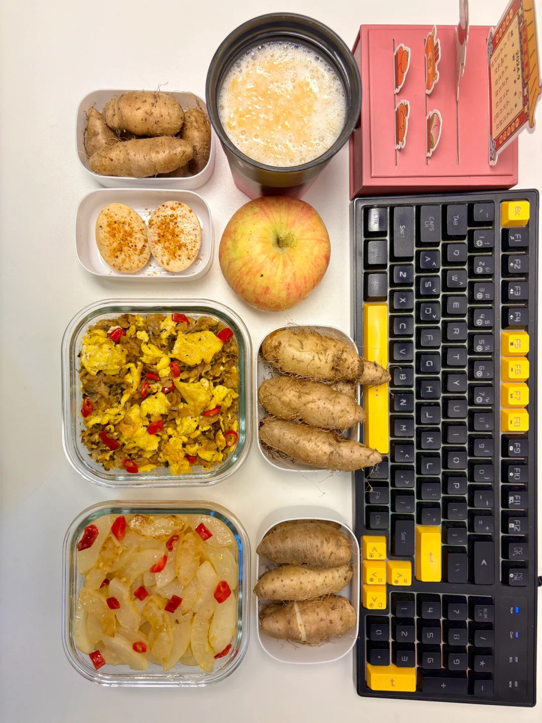 1⃣️早:毛薯、实蛋、燕麦(2.2💰) 2⃣️中:外婆菜炒鸡蛋、毛薯(3.4💰) 3⃣️晚:炒黄瓜、毛薯(1.7💰) 4️⃣水果:苹果(1💰) 合计:8.3💰