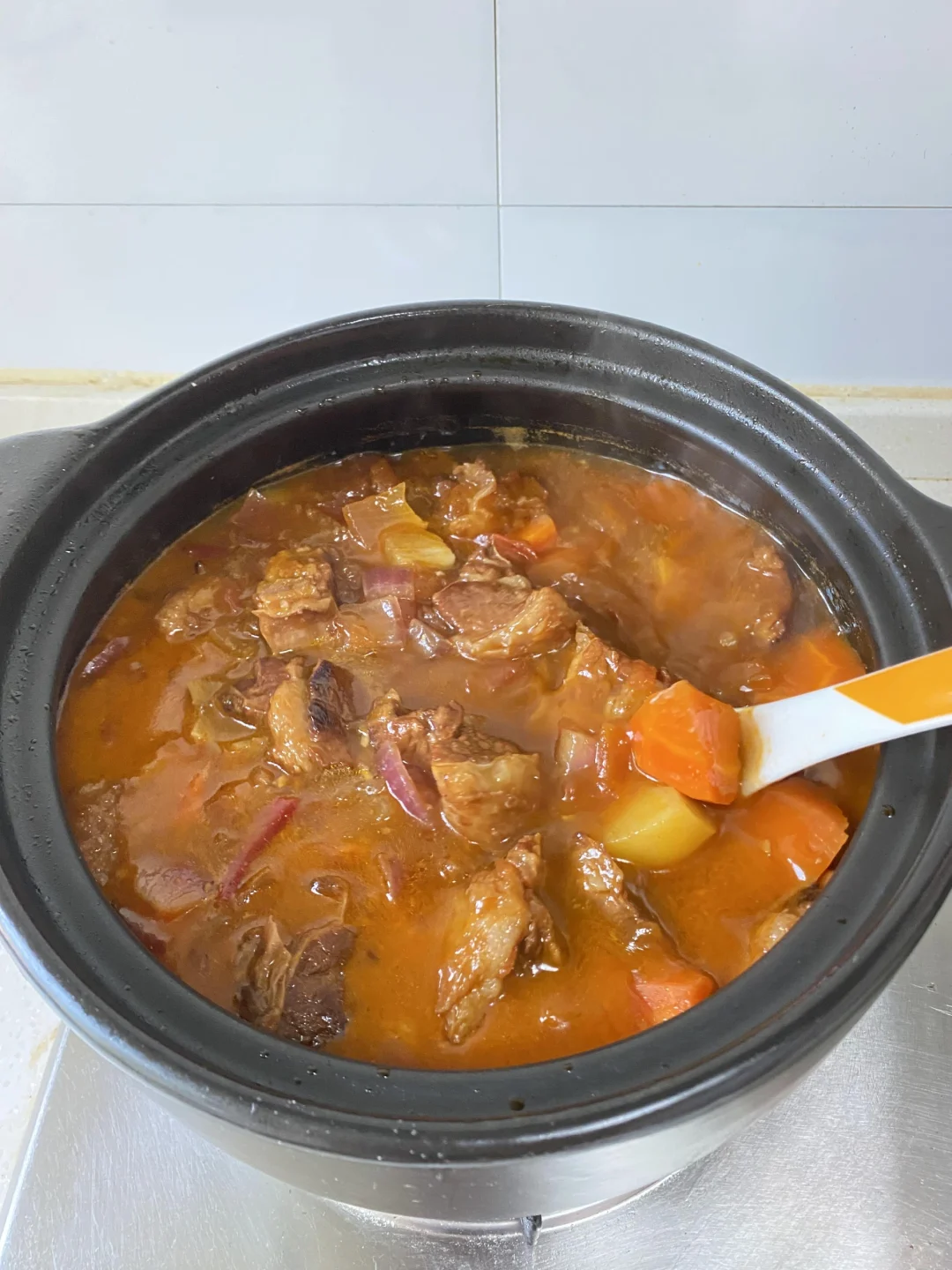 8️⃣倒土豆胡萝卜块再炖煮半小时后,加适量盐和鸡精调味