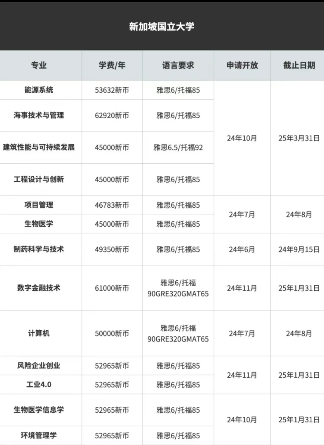 25Fall 新加坡申请及截止日期公布名单👇: