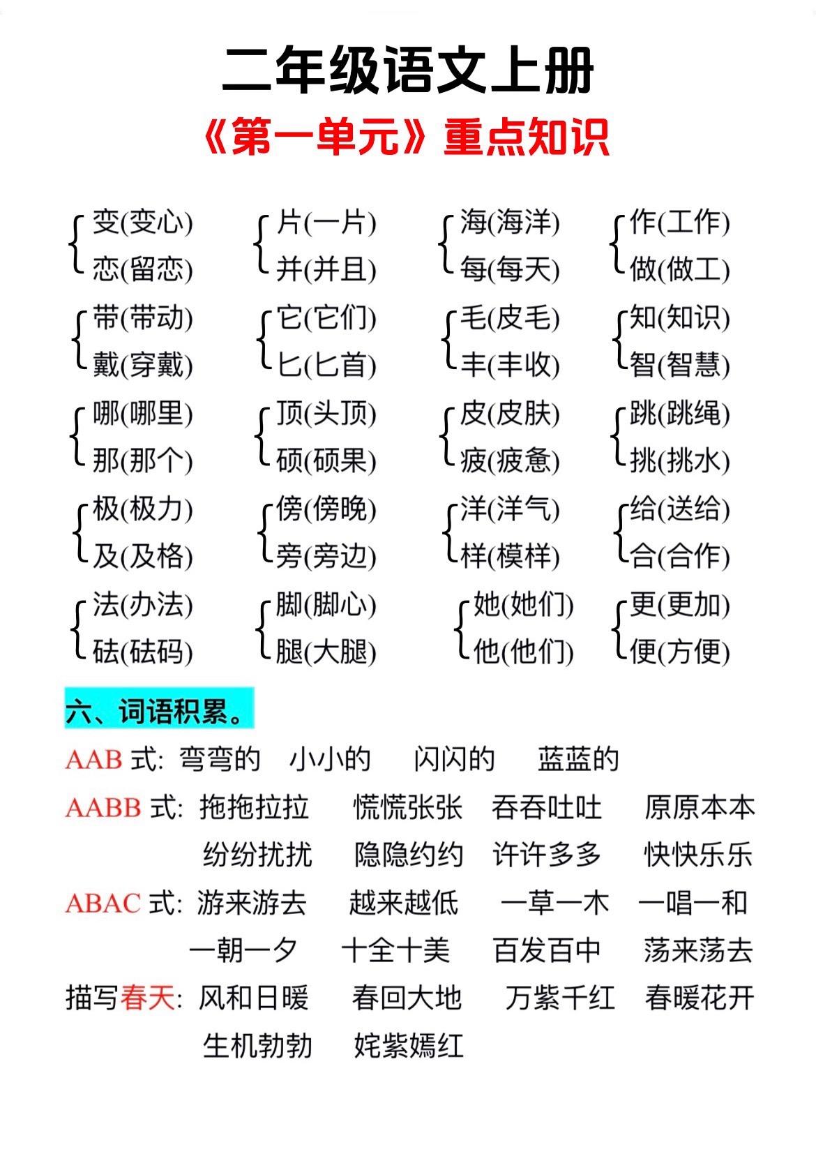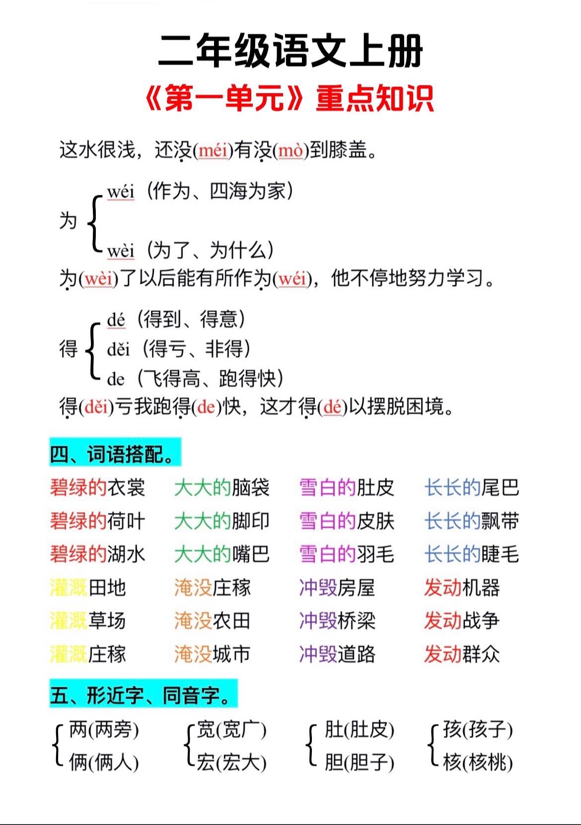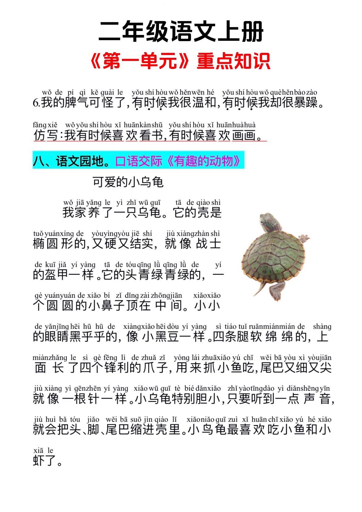 二上 第一单元知识总结。后面有单元测试,给孩子练一练。这套测试是稍稍...
