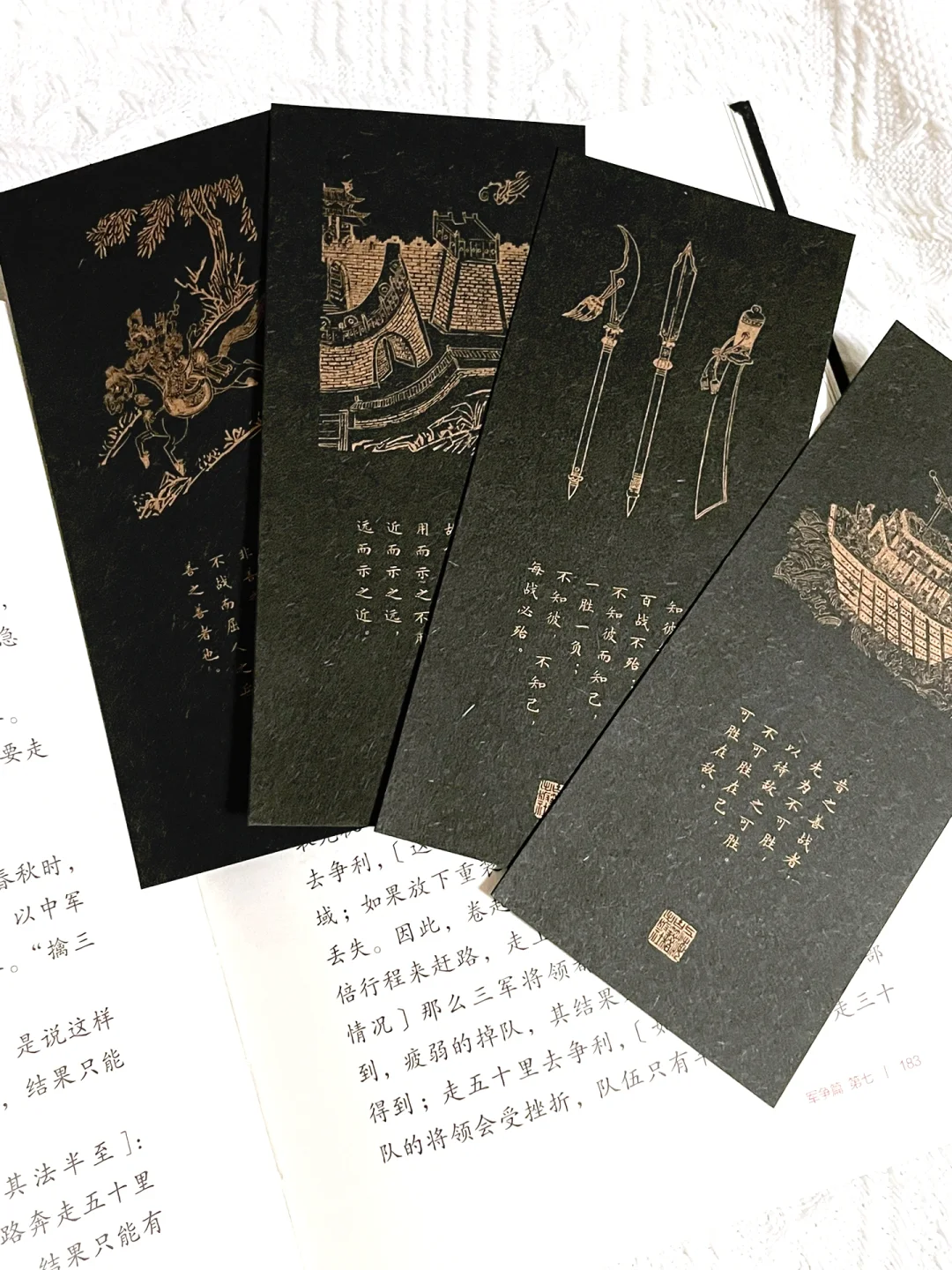 除此之外,书籍不仅外封采用了布面精装,内文更有双色印刷,将孙武、曹操、郭化若的军事思想融在一书。另外,还附赠了明代“画仙”吴彬绘《岁华纪胜·阅操图》复刻长卷一幅、宋代兵备版画书签四枚。