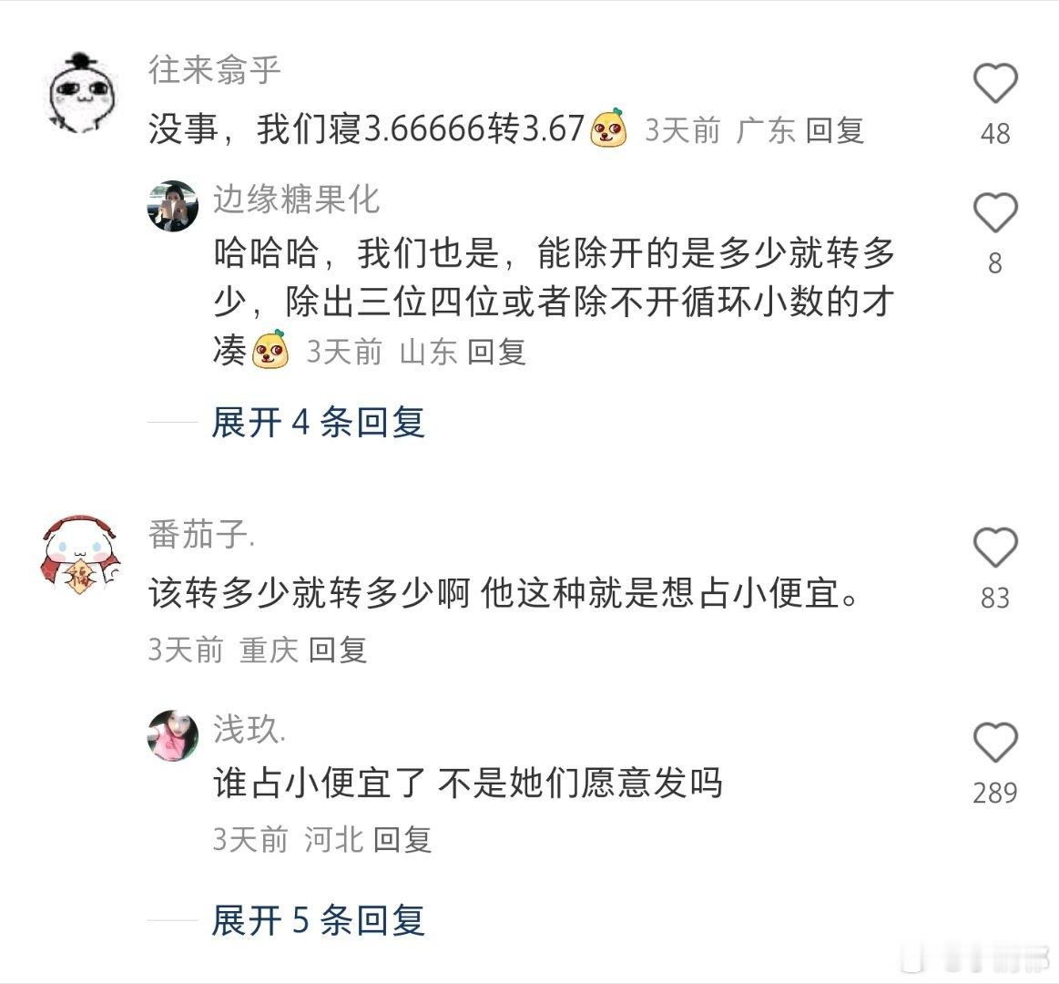 但是这次,应该付款3.666666...的,另外几个人转了4块,我只转了3.7。