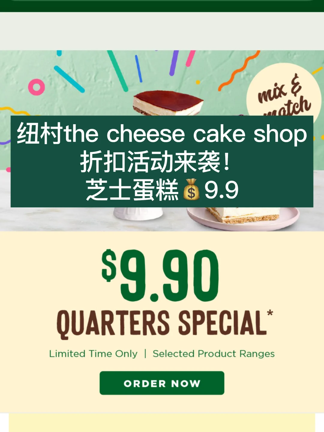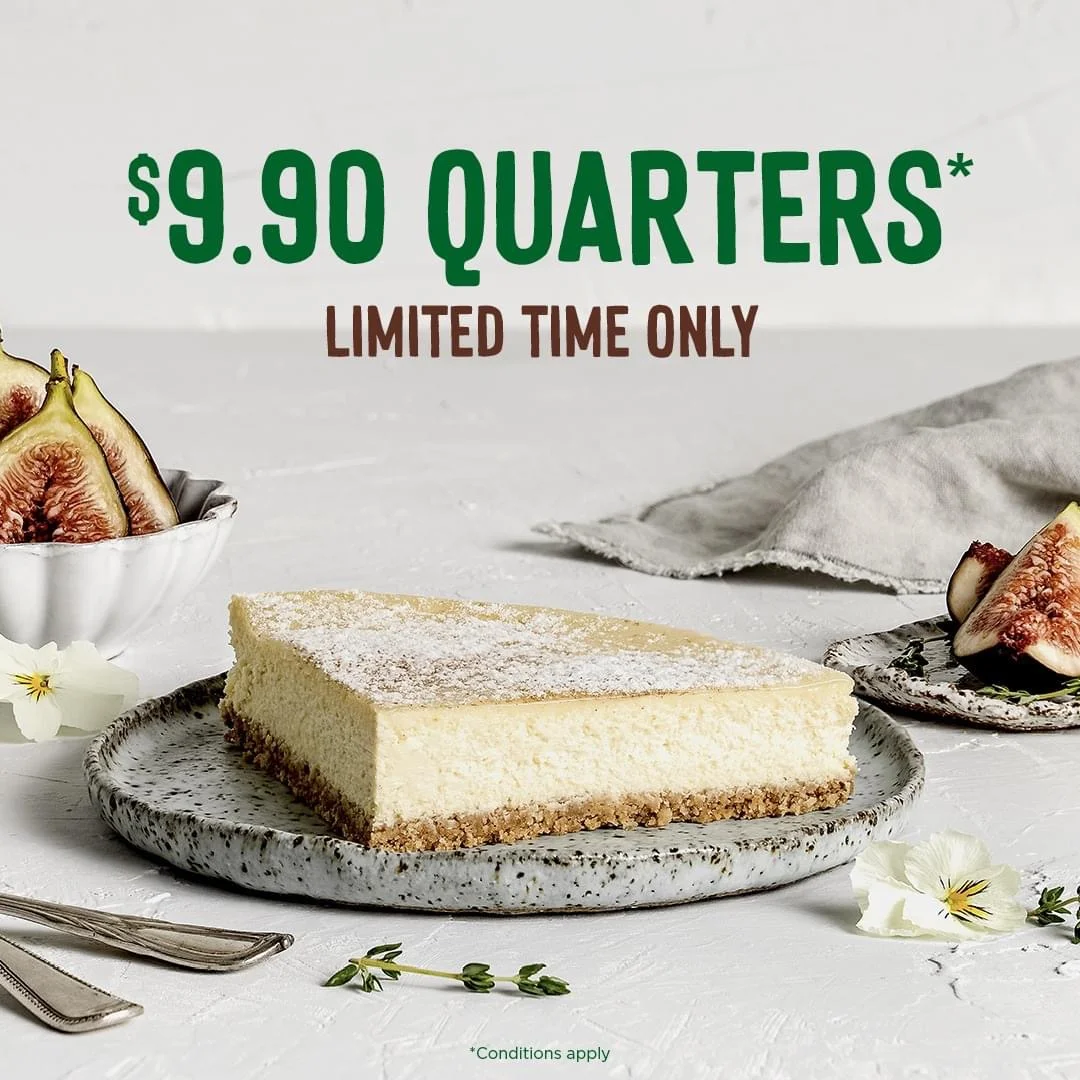 纽村The cheese cake shop现在推出💰9.9品尝一件(quarters)蛋糕活动!可以选择的种类包括 Cheesecakes, Baked Cheesecakes, Mudcakes, Tortes & Gateaux and Everyday Delights 从2024年9月16日开始,到2024年9月29日下午3点结束~ 这个价格可以一次品尝多种口味了!想要多种口味都能品尝到了这个活动千万不要错过[大笑R][大笑R] 关注我,下一篇更精彩