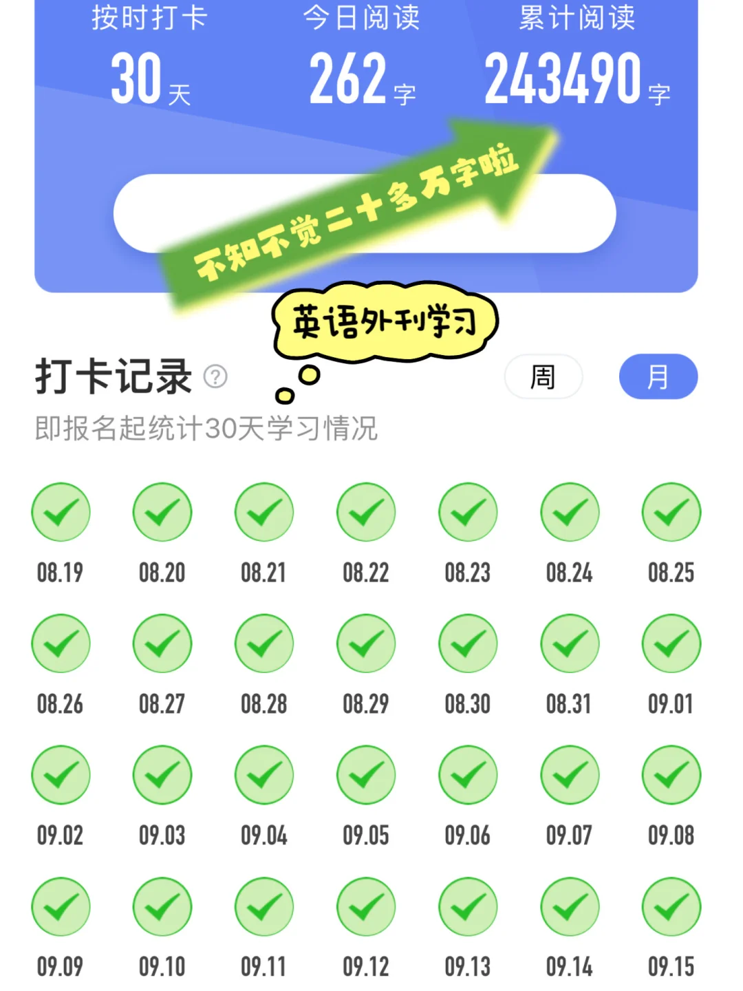 上次发贴的时候英语外刊阅读了十万多字! 如今已经二十多万啦✍️ ♥️ 相信坚持的力量✊ 而且语言学习一定要每日积累!! 教师这个职业也可以督促我更好的终身学习📖 Learning should never cease! 没有什么比不断获取新知识更快乐了吧😃