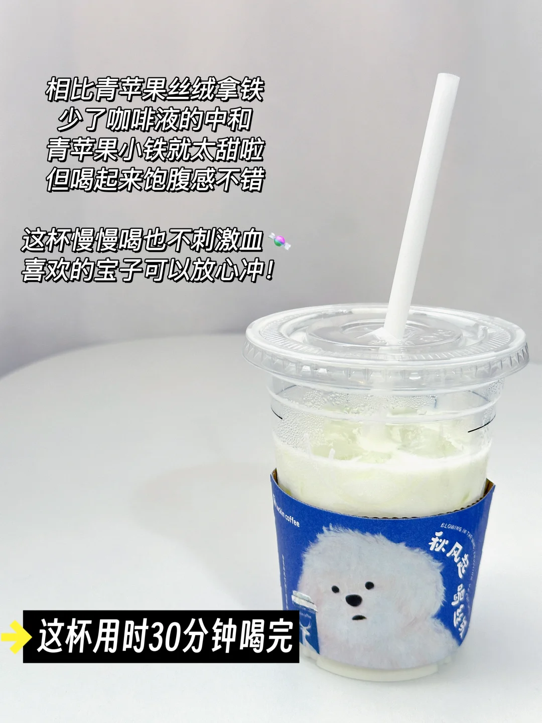 相比青苹果丝绒拿铁,少了咖啡液的中和,青苹果小铁就太甜啦,但喝起来饱腹感不错〰️