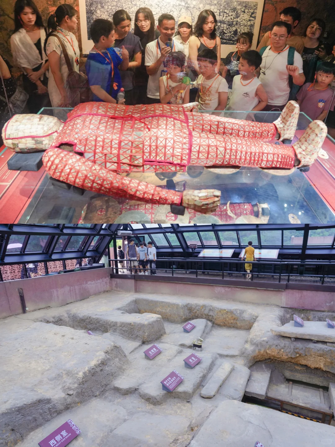 ✅3栋是主展厅,分为上下三层,有直梯和扶梯,其实主要内容还是讲述南越国的历史沿革以及展示出土文物。南越王珍宝展,玻璃尖顶像卢浮宫的建筑右手入,有两层,主要展示丝缕玉衣、玉佩、漆雕棺椁等 核心的随葬品都在这里。