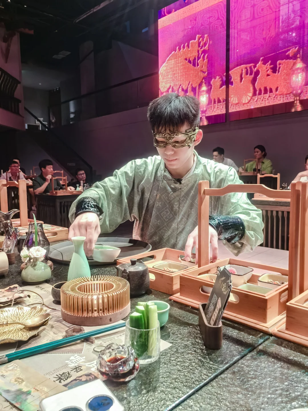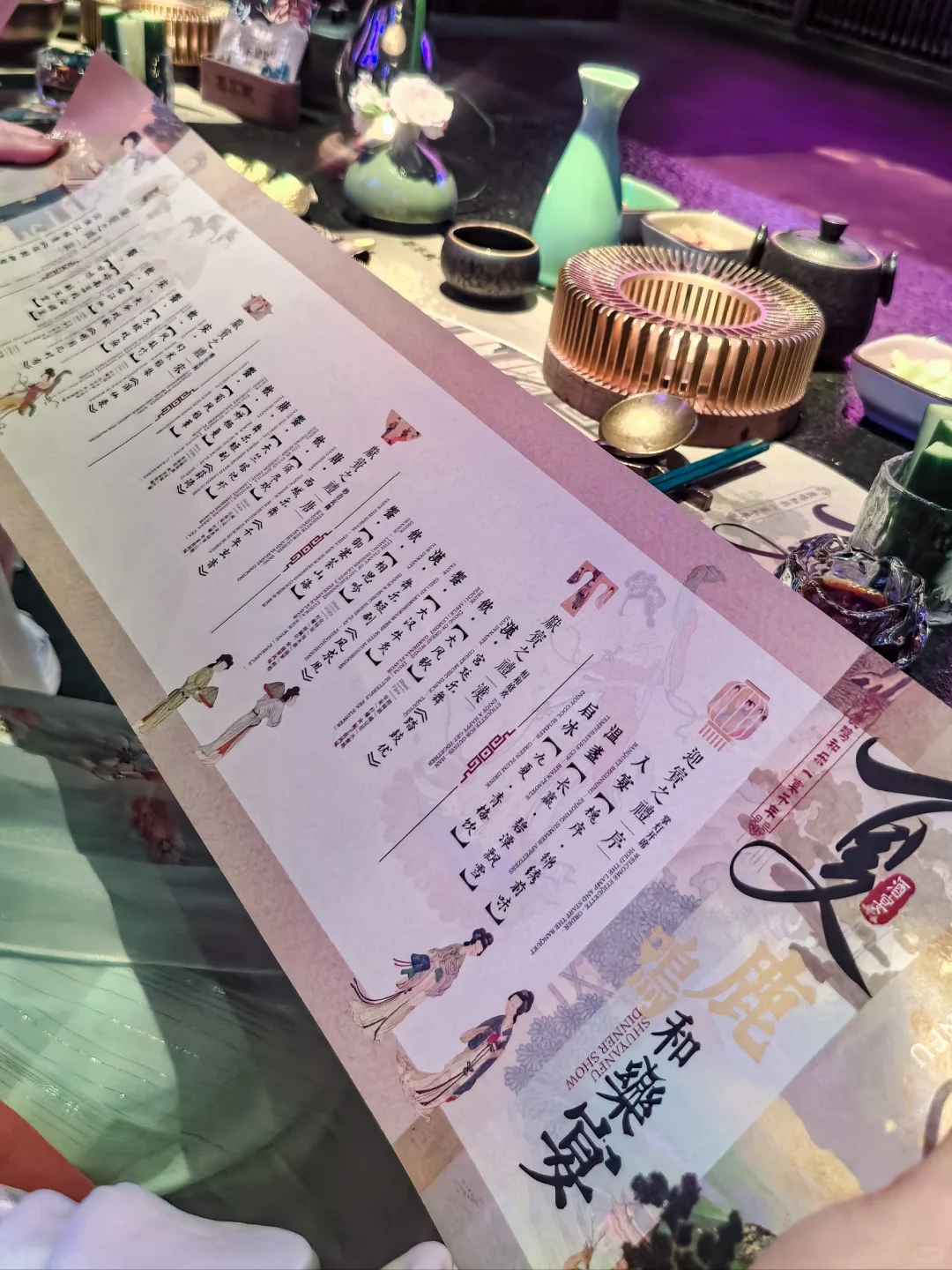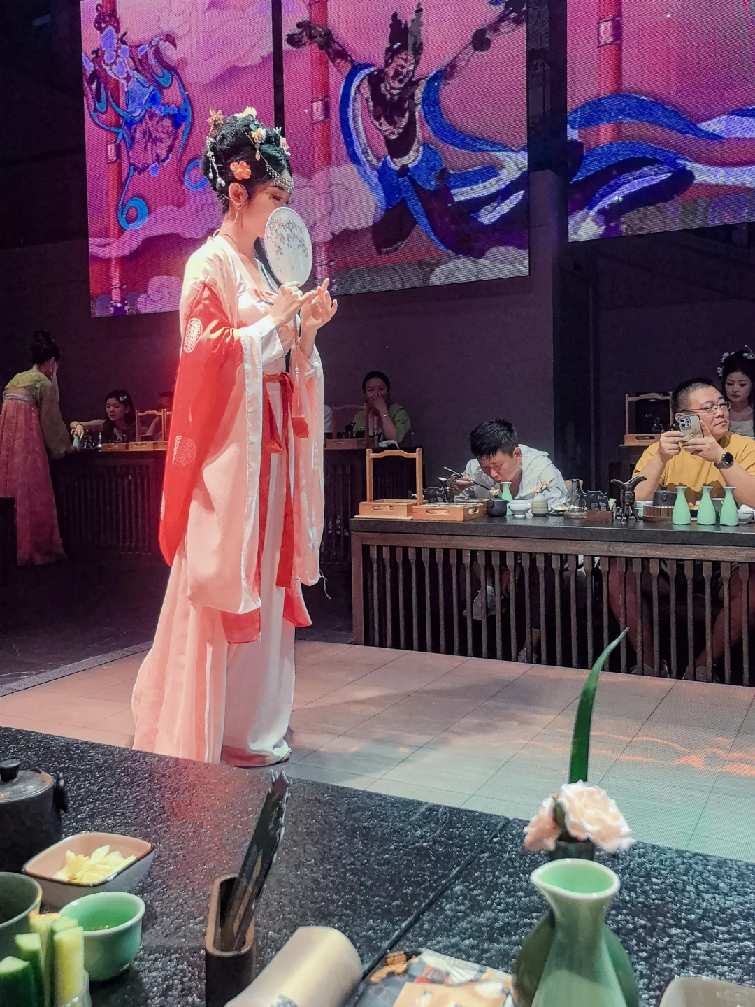 一道菜一支舞的形式,在伴随着乐曲品味着夏日佳肴,让人仿佛穿越回了古代。品尝美食的同时还能观看表演,带来感官享受,
