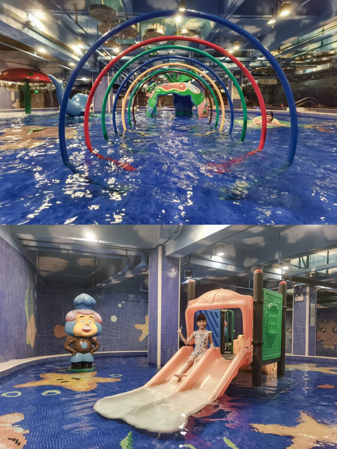👉🏻室内温泉水乐园,里面都是恒温的,有适合幼童的滑梯游乐池,大童的戏水池,玩水上滑滑梯,小象池、蘑菇池、水枪、珊瑚礁,大人们也可以在乐园里泡温泉