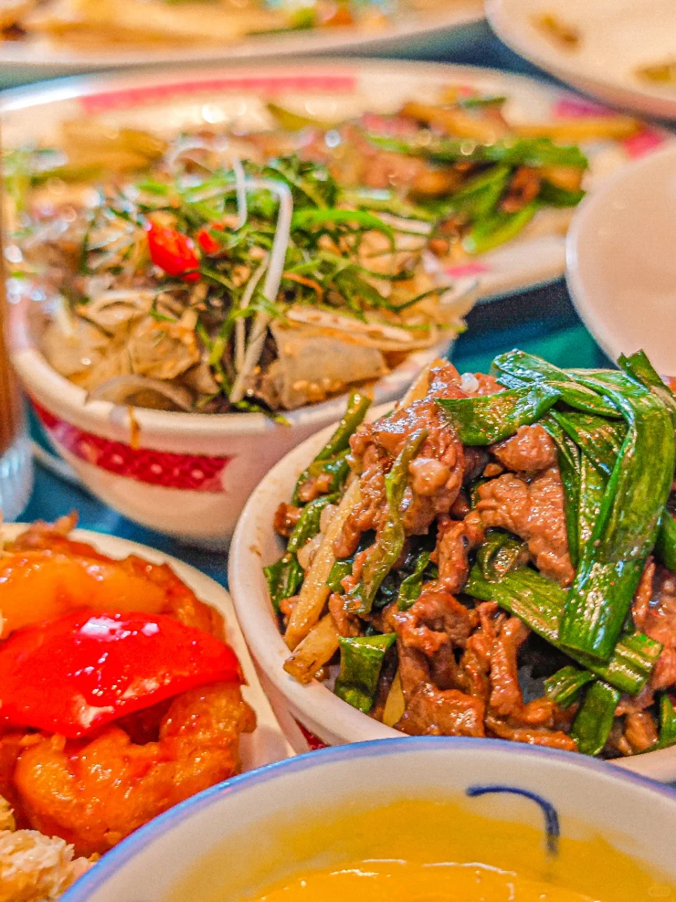 则是肉食爱好者的大满足。吊龙牛肉纹理清晰,肉质鲜嫩,在大火的爆炒下,葱姜的香气完美渗入每一丝肉里,入口即化,鲜香四溢,让人欲罢不能。🥩🧄