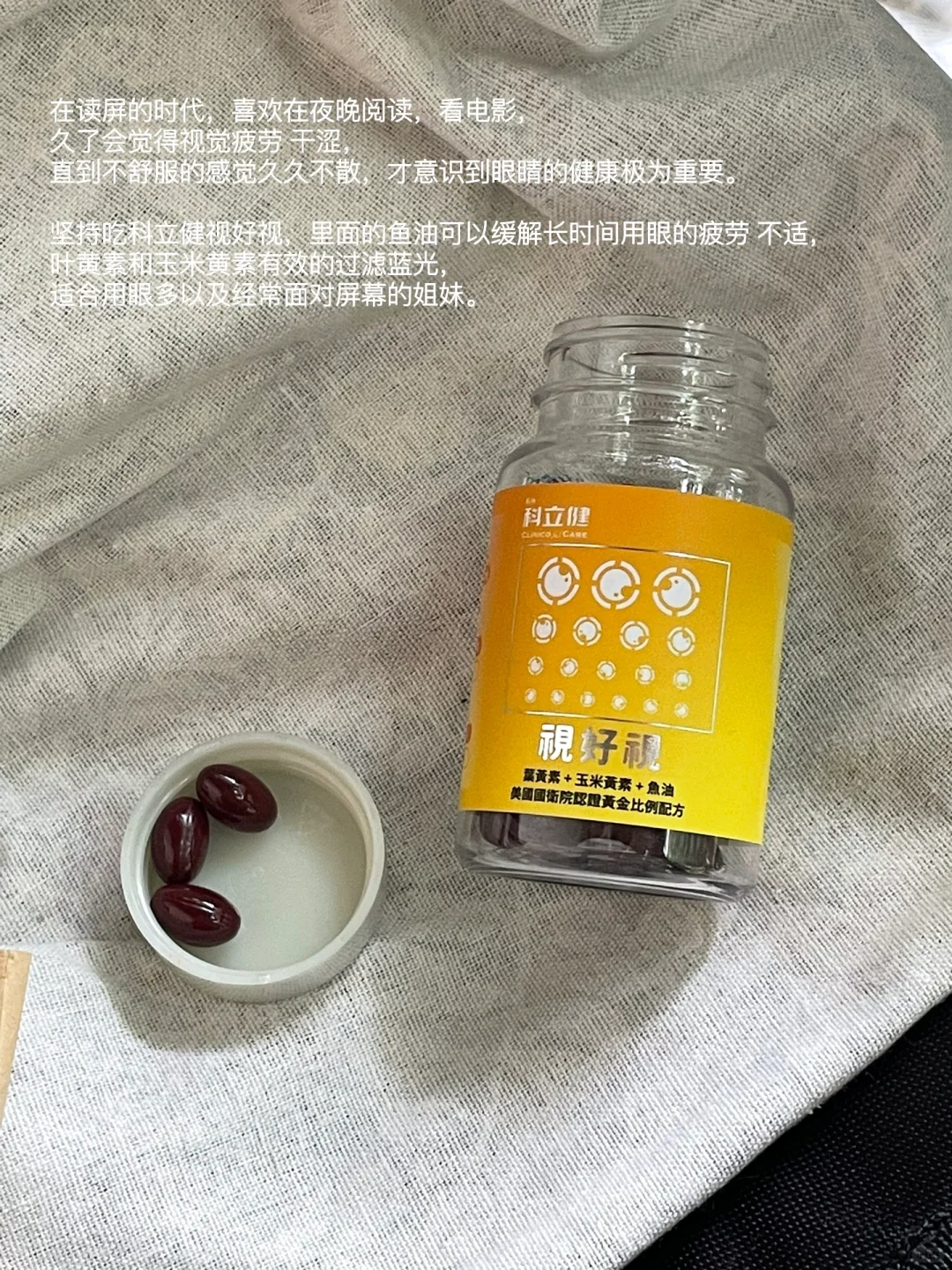 尝试很久终于找到门路,开始坚持吃科立健视好视,里面的鱼油可以缓解长时间用眼的疲劳不适感,叶黄素和玉米黄素有效的过滤蓝光,适合用眼多以及经常面对屏幕的姐妹。